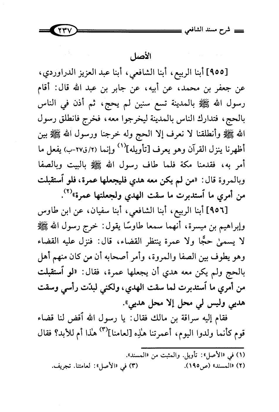 [956] أبنا الربيع، أبنا الشافعي، أبنا سفيان، عن ابن طاوس وإبراهيم بن ميسرة، أنهما سمعا طاوسًا يقول: خرج رسول الله - صلى الله عليه وسلم - لا يسمى حجًّا ولا عمرة ينتظر القضاء، قال: فنزل عليه القضاء وهو يطوف بين الصفا والمروة، وأمر أصحابه أن من كان منهم أهل بالحج ولم يكن معه هدي أن يجعلها عمرة، فقال: "لو استقبلت من أمري ما استدبرت لما سقت الهدي، ولكني لبدّت رأسي وسقت هديي وليس لي محل إلا محل هديي".
