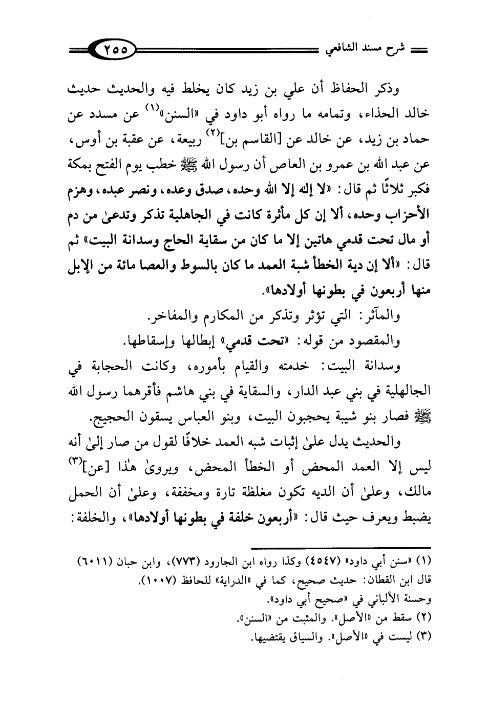 وذكر الحفاظ أن علي بن زيد كان يخلط فيه والحديث حديث خالد الحذاء، وتمامه ما رواه أبو داود في "السنن" (¬1) عن مسدد عن حماد بن زيد، عن خالد عن [القاسم بن] (¬2) ربيعة، عن عقبة بن أوس، عن عبد الله بن عمرو بن العاص أن رسول الله - صلى الله عليه وسلم - خطب يوم الفتح بمكة فكبر ثلاثًا ثم قال: "لا إله إلا الله وحده، صدق وعده، ونصر عبده، وهزم الأحزاب وحده، ألا إن كل مأثرة كانت في الجاهلية تذكر وتدعى من دم أو مال تحت قدمي هاتين إلا ما كان من سقاية الحاج وسدانة البيت" ثم قال: "ألا إن دية الخطأ شبة العمد ما كان بالسوط والعصا مائة من الإبل منها أربعون في بطونها أولادها".