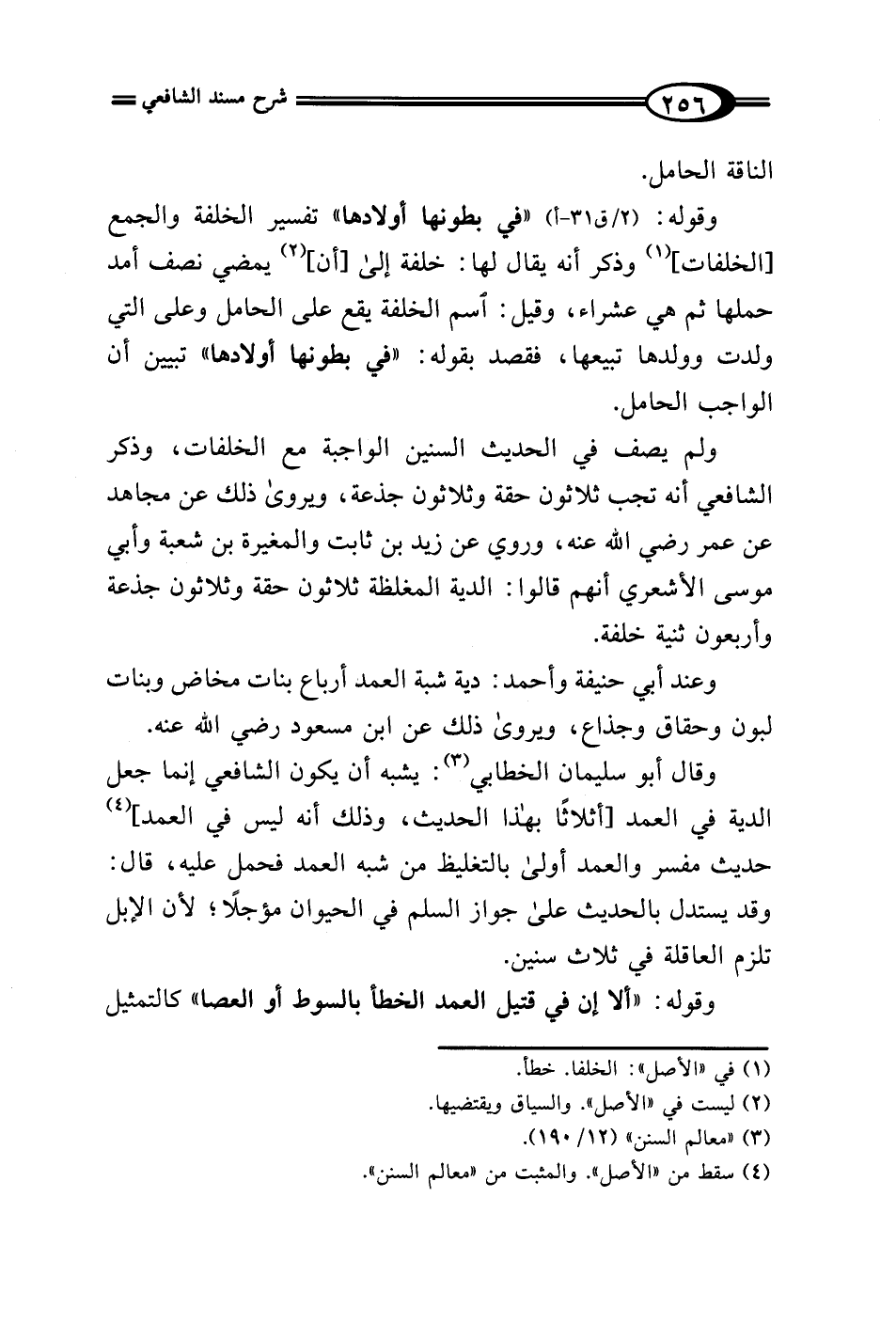 ولم يصف في الحديث السنين الواجبة مع الخلفات، وذكر الشافعي أنه تجب ثلاثون حقة وثلاثون جذعة، ويروى ذلك عن مجاهد عن عمر رضي الله عنه، وروي عن زيد بن ثابت والمغيرة بن شعبة وأبي موسى الأشعري أنهم قالوا: الدية المغلظة ثلاثون حقة وثلاثون جذعة وأربعون ثنية خلفة.