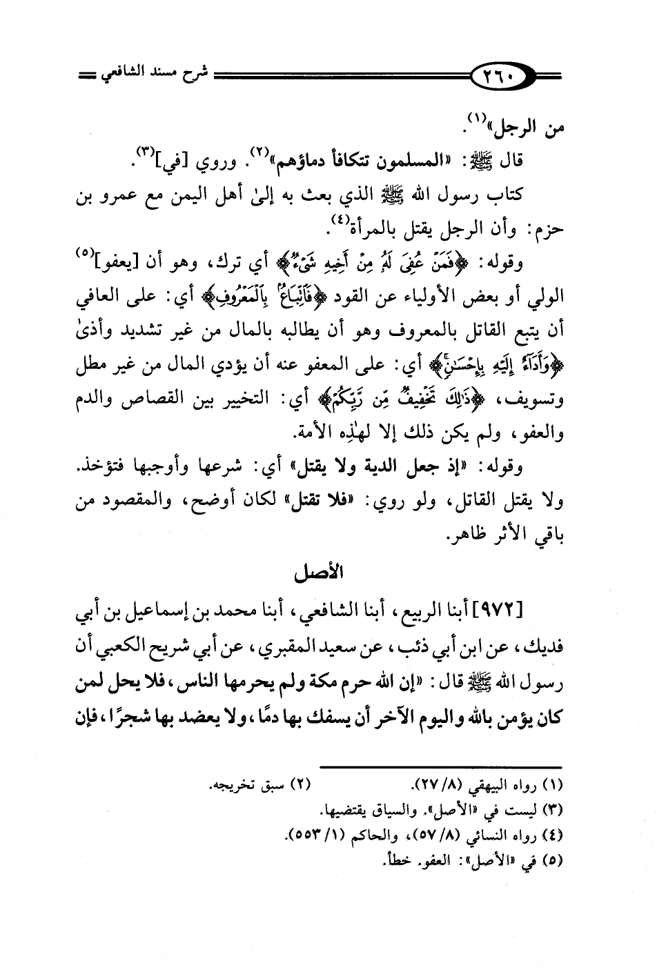 [972] أبنا الربيع، أبنا الشافعي، أبنا محمَّد بن إسماعيل بن أبي فديك، عن ابن أبي ذئب، عن سعيد المقبري، عن أبي شريح الكعبي أن رسول الله - صلى الله عليه وسلم - قال: "إن الله حرم مكة ولم يحرمها الناس، فلا يحل لمن كان يؤمن بالله واليوم الآخر أن يسفك بها دمًا، ولا يعضد بها شجرًا، فإن