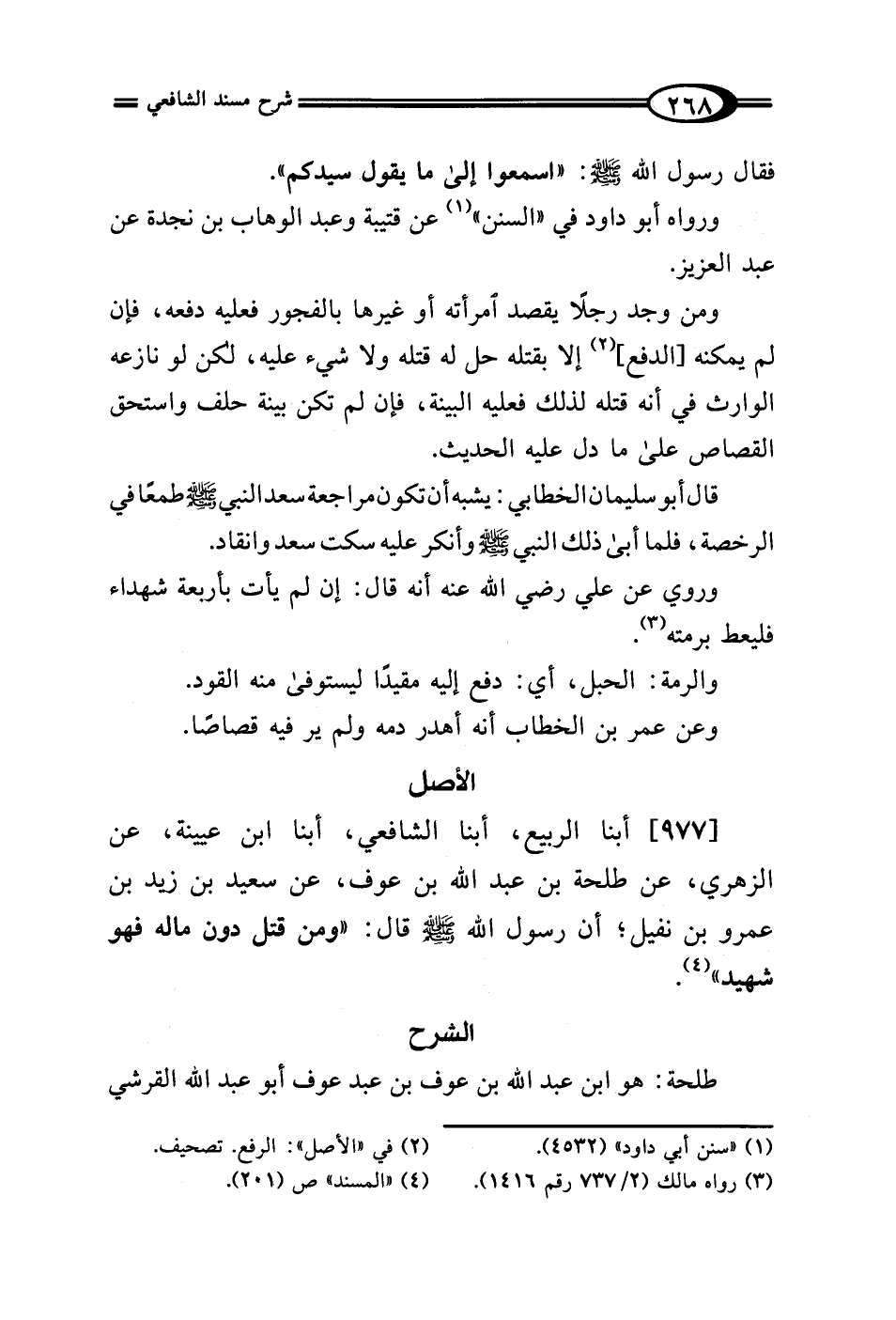 [977] أبنا الربيع، أبنا الشافعي، أبنا ابن عيينة، عن الزهري، عن طلحة بن عبد الله بن عوف، عن سعيد بن زيد بن عمرو بن نفيل؛ أن رسول الله - صلى الله عليه وسلم - قال: "ومن قتل دون ماله فهو شهيد" (¬4).