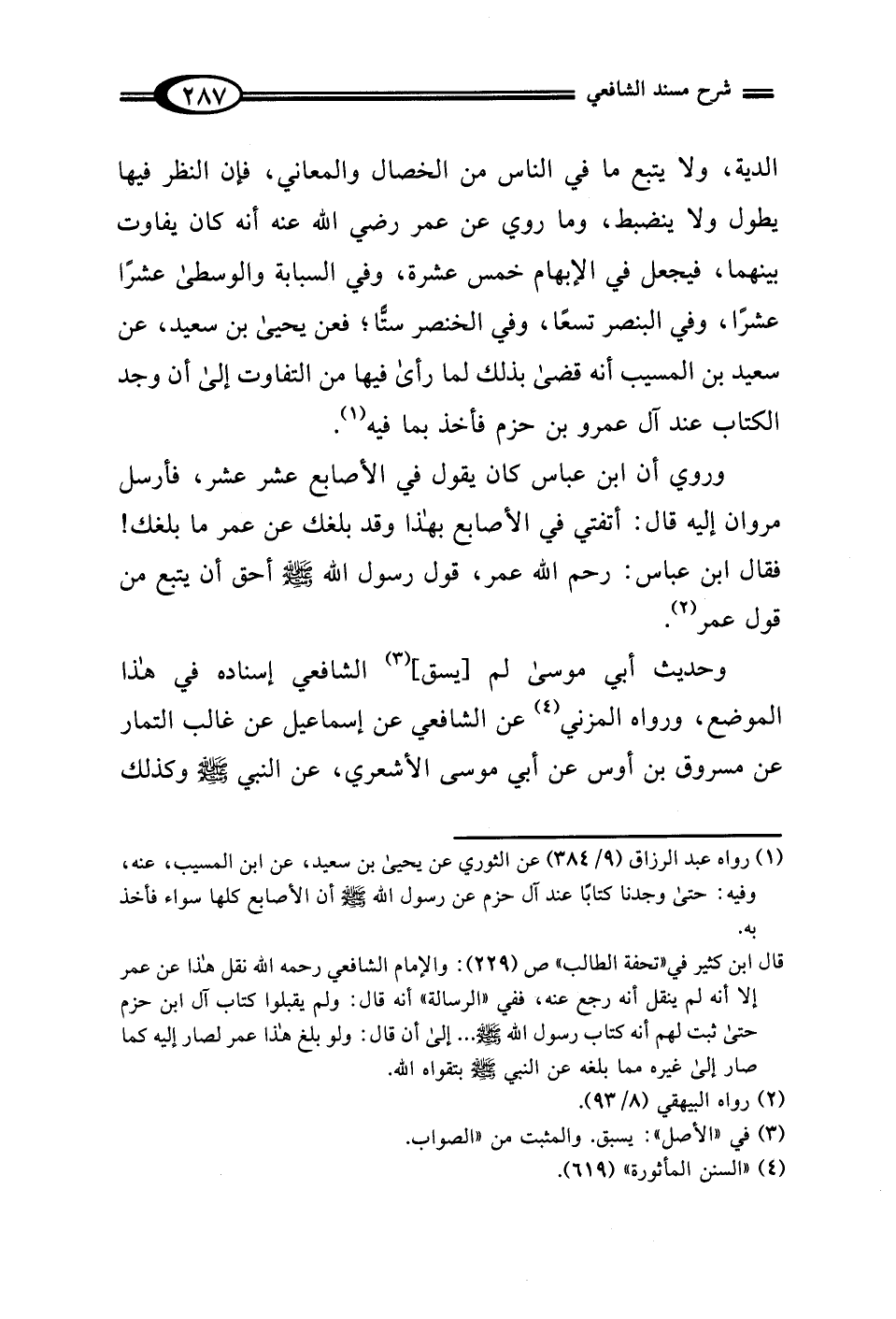 (¬1) رواه عبد الرزاق (9/ 384) عن الثوري عن يحيى بن سعيد، عن ابن المسيب، عنه، وفيه: حتى وجدنا كتابًا عند آل حزم عن رسول الله - صلى الله عليه وسلم - أن الأصابع كلها سواء فأخذ به.
