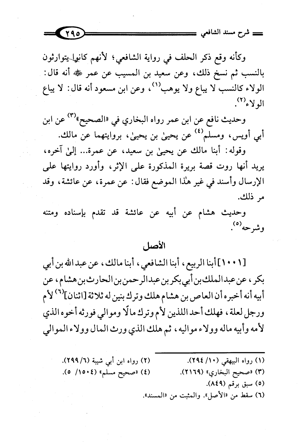 [1001] أبنا الربيع، أبنا الشافعي، أبنا مالك، عن عبد الله بن أبي بكر، عن عبد الملك بن أبي بكر بن عبد الرحمن بن الحارث بن هشام، عن أبيه أنه أخبره أن العاص بن هشام هلك وترك بنين له ثلاثة [اثنان] (¬6) لأم ورجل لعلة، فهلك أحد اللذين لأم وترك مالًا وموالي فورثه أخوه الذي لأمه وأبيه ماله وولاء مواليه، ثم هلك الذي ورث المال وولاء الموالي