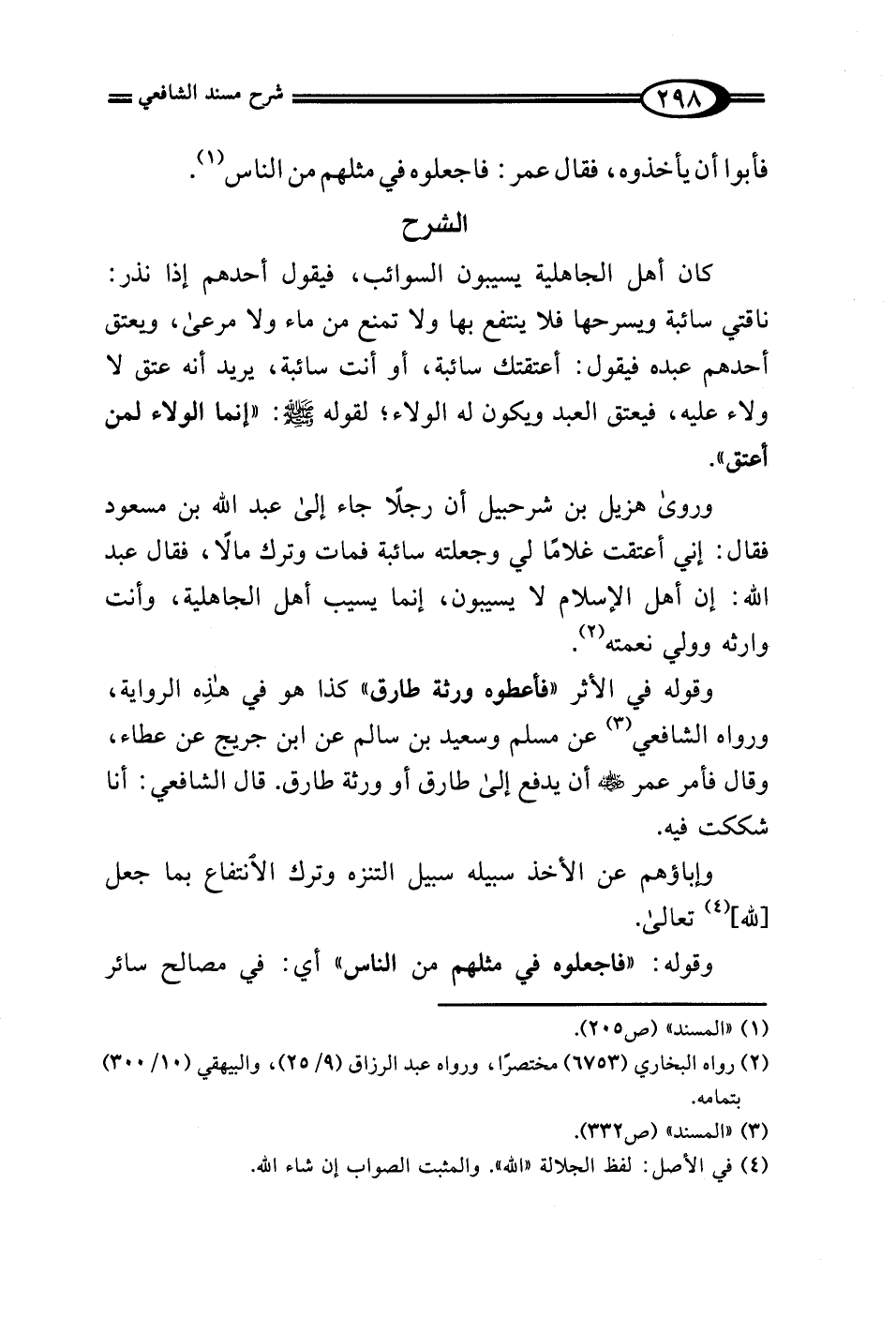 وروى هزيل بن شرحبيل أن رجلًا جاء إلى عبد الله بن مسعود فقال: إني أعتقت غلامًا لي وجعلته سائبة فمات وترك مالًا، فقال عبد الله: إن أهل الإِسلام لا يسيبون، إنما يسيب أهل الجاهلية، وأنت وارثه وولي نعمته (¬2).