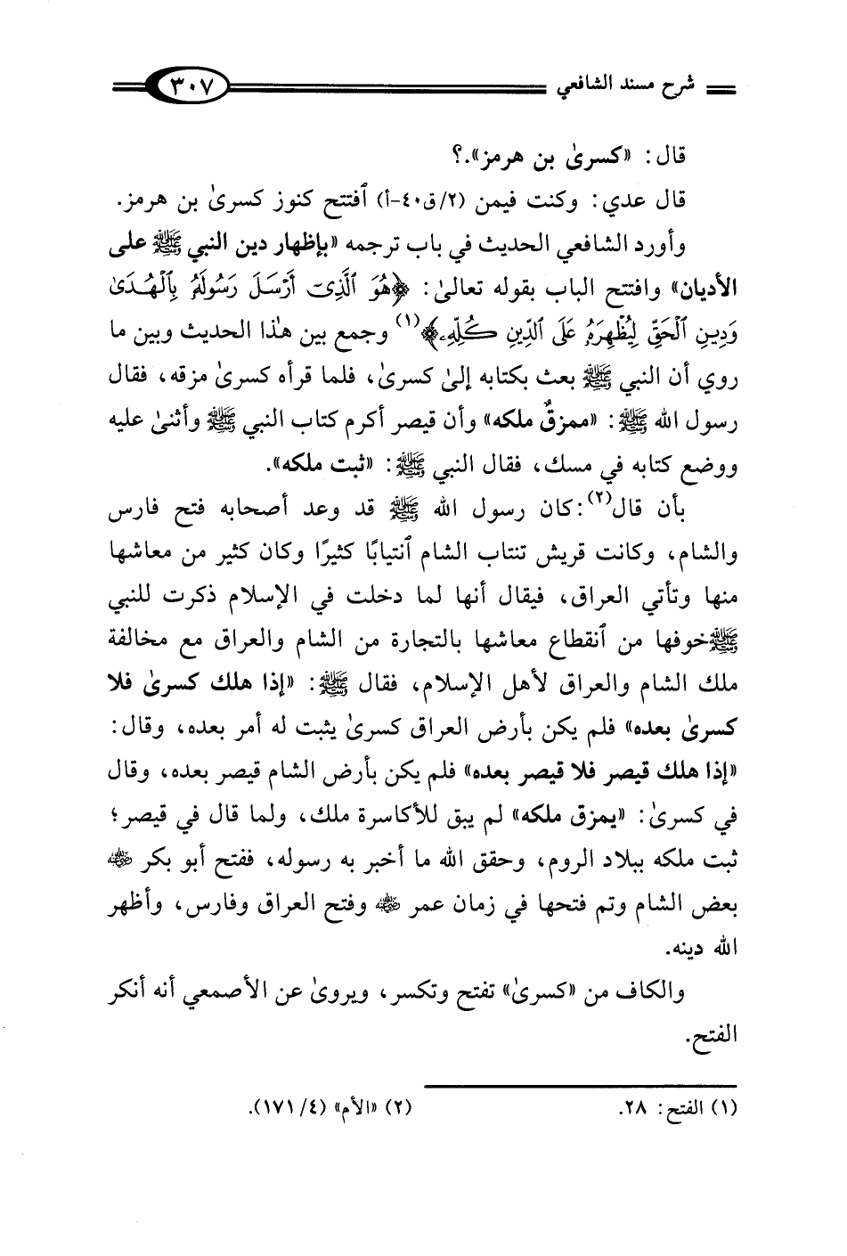 وأورد الشافعي الحديث في باب ترجمه "بإظهار دين النبي - صلى الله عليه وسلم - على الأديان" وافتتح الباب بقوله تعالى: {هُوَ الَّذِي أَرْسَلَ رَسُولَهُ بِالْهُدَى وَدِينِ الْحَقِّ لِيُظْهِرَهُ عَلَى الدِّينِ كُلِّهِ} (¬1) وجمع بين هذا الحديث وبين ما روي أن النبي - صلى الله عليه وسلم - بعث بكتابه إلى كسرى، فلما قرأه كسرى مزقه، فقال رسول الله - صلى الله عليه وسلم -: "ممزقٌ ملكه" وأن قيصر أكرم كتاب النبي - صلى الله عليه وسلم - وأثنى عليه ووضع كتابه في مسك، فقال النبي - صلى الله عليه وسلم -: "ثبت ملكه".