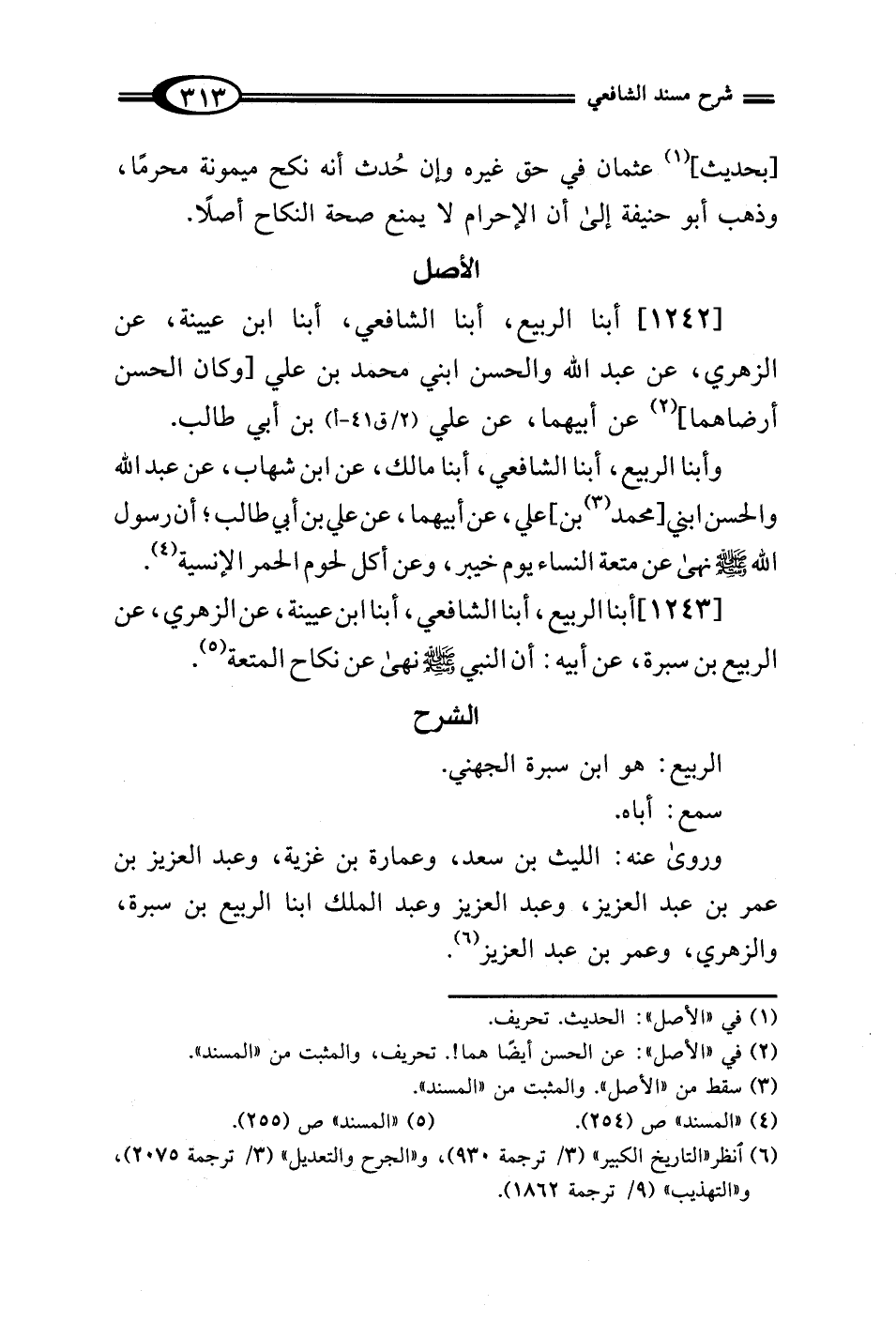 [1243] أبنا الربيع، أبنا الشافعي، أبنا ابن عيينة، عن الزهري، عن الربيع بن سبرة، عن أبيه: أن النبي - صلى الله عليه وسلم - نهى عن نكاح المتعة (¬5).