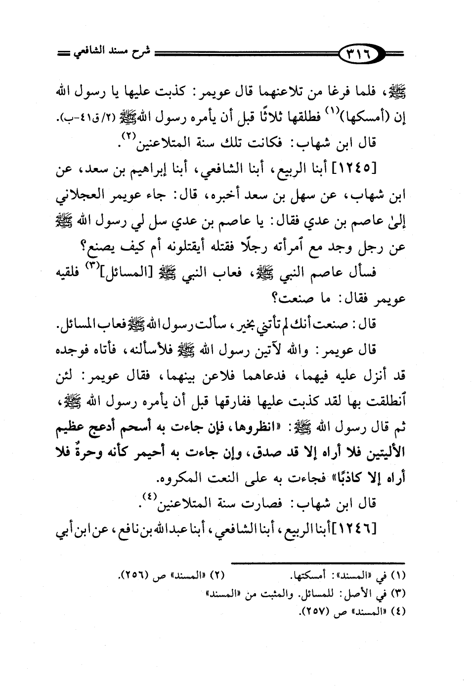 [1245] أبنا البربيع، أبنا الشافعي، أبنا إبراهيم بن سعد، عن ابن شهاب، عن سهل بن سعد أخبره، قال: جاء عويمر العجلاني إلى عاصم بن عدي فقال: يا عاصم بن عدي سل لي رسول الله - صلى الله عليه وسلم - عن رجل وجد مع امرأته رجلًا فقتله أيقتلونه أم كيف يصنع؟