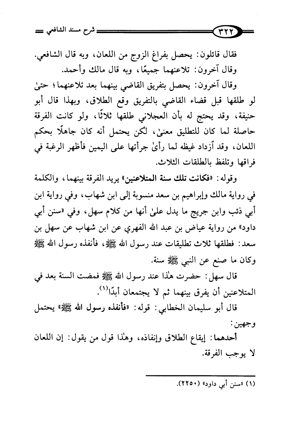 قال سهل: حضرت هذا عند رسول الله - صلى الله عليه وسلم - فمضت السنة بعد في المتلاعنين أن يفرق بينهما ثم لا يجتمعان أبدًا (¬1).