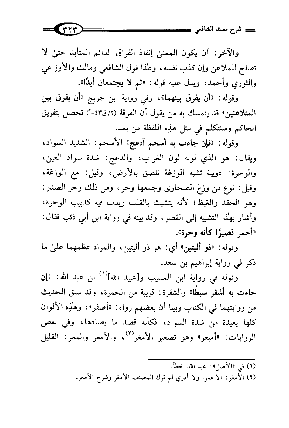 وقوله في رواية ابن المسيب و [عبيد الله] (¬1) بن عبد الله: "إن جاءت به أشقر سبطًا" والشقرة: قريبة من الحمرة، وقد سبق الحديث من روايتهما في الكتاب وبينا أن بعضهم رواه: "أصفر"، وهذه الألوان كلها بعيدة من شدة السواد، فكأنه قصد ما يضادها، وفي بعض الروايات: "أميغر" وهو تصغير الأمغر (¬2)، والأمعر والمعر: القليل