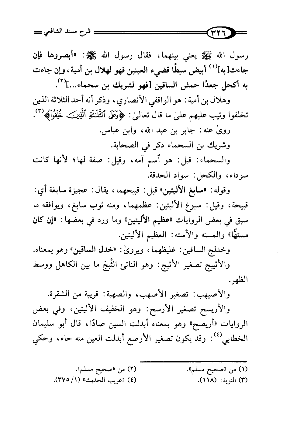 وقوله: "سابغ الأليتين" قيل: قبيحهما، يقال: عجيزة سابغة أي: قبيحة، وقيل: سبوغ الأليتين: عظمهما، ومنه ثوب سابغ، ويوافقه ما سبق في بعض الروايات "عظيم الأليتين" وما ورد في بعضها: "إن كان مستهًّا" والمسته والأسته: العظيم الأليتين.
