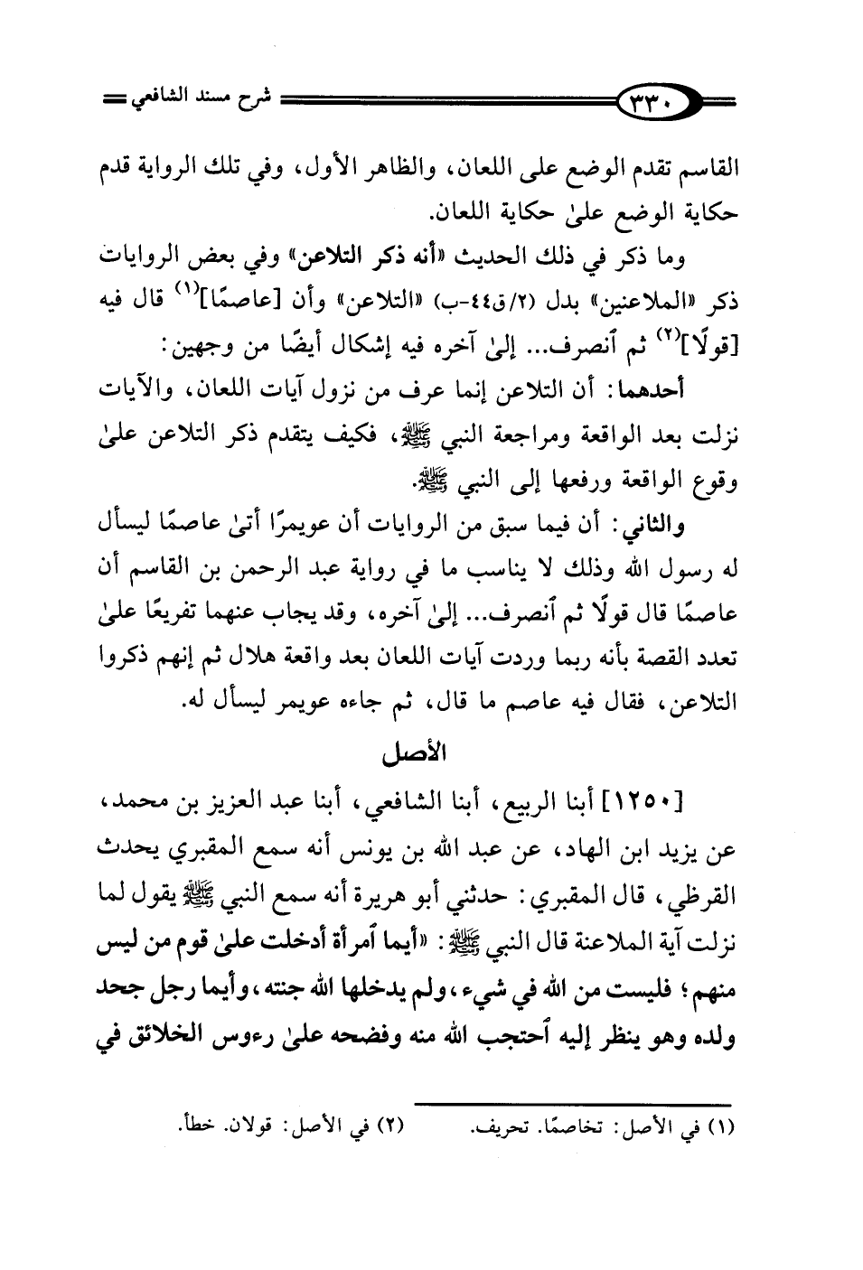[1250] أبنا الربيع، أبنا الشافعي، أبنا عبد العزيز بن محمَّد، عن يزيد ابن الهاد، عن عبد الله بن يونس أنه سمع المقبري يحدث القرظي، قال المقبري: حدثني أبو هريرة أنه سمع النبي - صلى الله عليه وسلم - يقول لما نزلت آية الملاعنة قال النبي - صلى الله عليه وسلم -: "أيما امرأة أدخلت على قوم من ليس منهم؛ فليست من الله في شيء، ولم يدخلها الله جنته، وأيما رجل جحد ولده وهو ينظر إليه احتجب الله منه وفضحه على رءوس الخلائق في