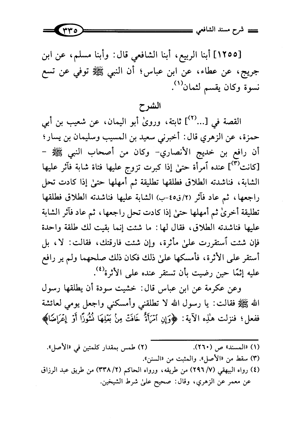 القصة في [... (¬2)] ثابتة، وروى أبو اليمان، عن شعيب بن أبي حمزة، عن الزهري قال: أخبرني سعيد بن المسيب وسليمان بن يسار؛ أن رافع بن خديج الأنصاري -وكان من أصحاب النبي - صلى الله عليه وسلم -[كانت (¬3)] عنده امرأة حتى إذا كبرت تزوج عليها فتاة شابة فآثر عليها الشابة، فناشدته الطلاق فطلقها تطليقة ثم أمهلها حتى إذا كادت تحل راجعها، ثم عاد فآثر الشابة عليها فناشدته الطلاق فطلقها تطليقة أخرى ثم أمهلها حتى إذا كادت تحل راجعها، ثم عاد فآثر الشابة عليها فناشدته الطلاق، فقال لها: ما شئت إنما بقيت لك طلقة واحدة فإن شئت استقررت على مأثرة، وإن شئت فارقتك، فقالت: لا، بل أستقر على الأثرة، فأمسكها على ذلك فكان ذلك صلحهما ولم ير رافع عليه إثمًا حين رضيت بأن تستقر عنده على الأثرة (¬4).
