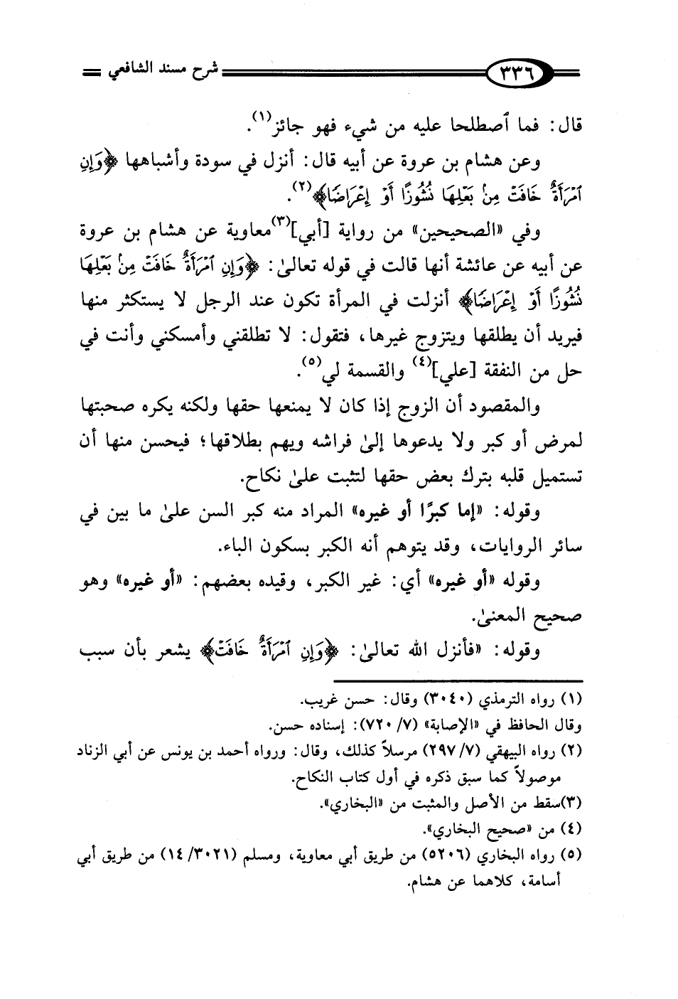 وفي "الصحيحين" من رواية [أبي] (¬3) معاوية عن هشام بن عروة عن أبيه عن عائشة أنها قالت في قوله تعالى: {وَإِنِ امْرَأَةٌ خَافَتْ مِنْ بَعْلِهَا نُشُوزًا أَوْ إِعْرَاضًا} أنزلت في المرأة تكون عند الرجل لا يستكثر منها فيريد أن يطلقها ويتزوج غيرها، فتقول: لا تطلقني وأمسكني وأنت في حل من النفقة [علي] (¬4) والقسمة لي (¬5).
