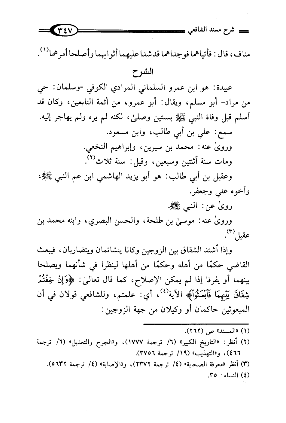 عبيدة: هو ابن عمرو السلماني المرادي الكوفي -وسلمان: حي من مراد- أبو مسلم، ويقال: أبو عمرو، من أئمة التابعين، وكان قد أسلم قبل وفاة النبي - صلى الله عليه وسلم - بسنتين وصلى، لكنه لم يره ولم يهاجر إليه.