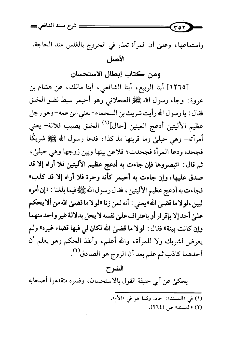 [1265] أبنا الربيع، أبنا الشافعي، أبنا مالك، عن هشام بن عروة: وجاء رسول الله - صلى الله عليه وسلم - العجلاني وهو أحيمر سبي نضو الخلق فقال: يا رسول الله - صلى الله عليه وسلم - رأيت شريك بن السحماء -يعني ابن عمه- وهو رجل عظيم الأليتين أدعج العينين [حال] (¬1) الخلق يصيب فلانة -يعني امرأته- وهي حبلى وما قربتها مذ كذا، فدعا رسول الله - صلى الله عليه وسلم - شريكًا فجحده ودعا المرأة فجحدت؛ فلاعن بينها وبين زوجها وهي حبلى، ثم قال: "تبصروها فإن جاءت به أدعج عظيم الأليتين فلا أراه إلا قد صدق عليها، وإن جاءت به أحيمر كأنه وحرة فلا أراه إلا قد كذب" فجاءت به أدعج عظيم الأليتين، فقال رسول الله - صلى الله عليه وسلم - فيما بلغنا: "إن أمره لبين، لولا ما قضى الله" يعني: أنه لمن زنا "لولا ما قضى الله من ألا يحكم على أحد إلا بإقرار أو باعتراف على نفسه لا يحل بدلالة غير واحد منهما وإن كانت بينة" فقال: "لولا ما قضى الله لكان لي فيها قضاء غيره" ولم يعرض لشريك ولا للمرأة، والله أعلم، وأنفذ الحكم وهو يعلم أن أحدهما كاذب ثم علم بعد أن الزوج هو الصادق (¬2).