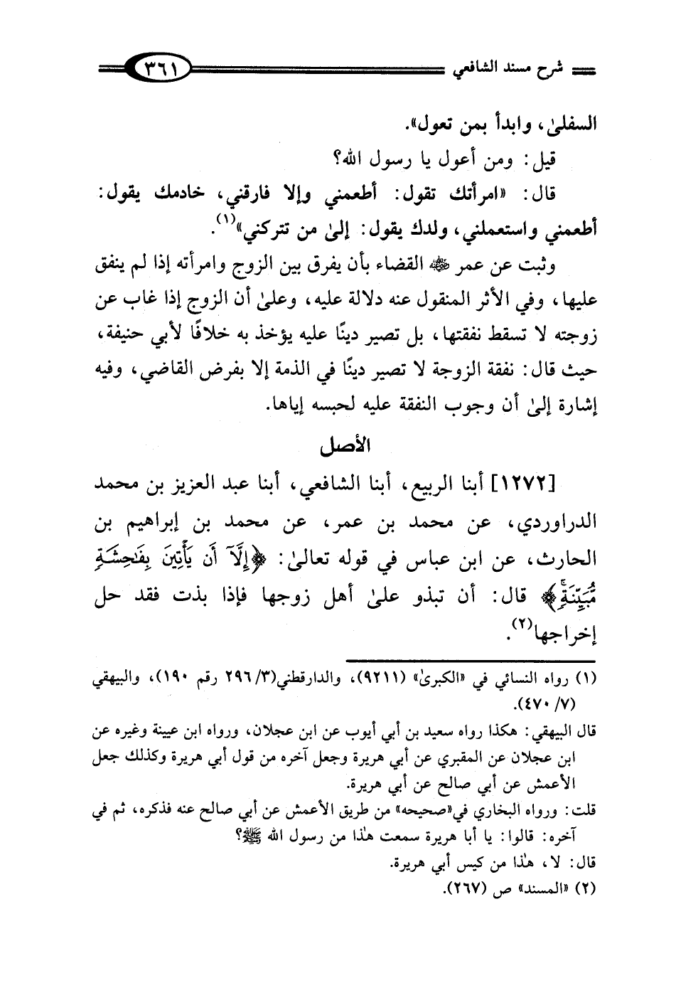 [1272] أبنا الربيع، أبنا الشافعي، أبنا عبد العزيز بن محمَّد الدراوردي، عن محمَّد بن عمر، عن محمَّد بن إبراهيم بن الحارث، عن ابن عباس في قوله تعالى: {إِلَّا أَنْ يَأْتِينَ بِفَاحِشَةٍ مُبَيِّنَةٍ} قال: أن تبذو على أهل زوجها فإذا بذت فقد حل إخراجها (¬2).