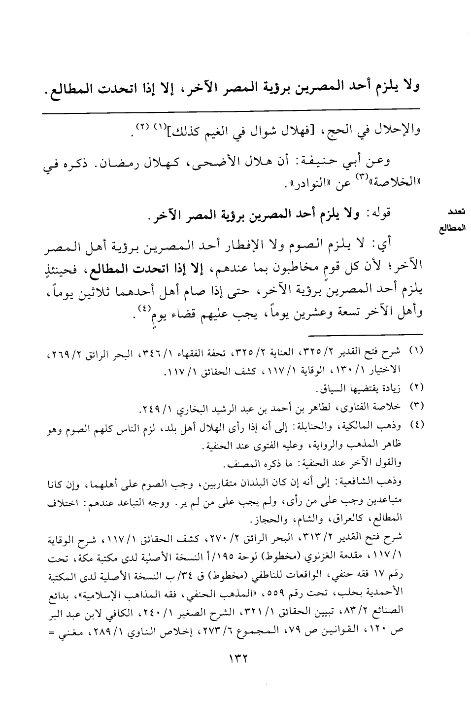ولا يلزم أحد المصرين برؤية المصر الآخر، إلا إذا اتحدت المطالع.