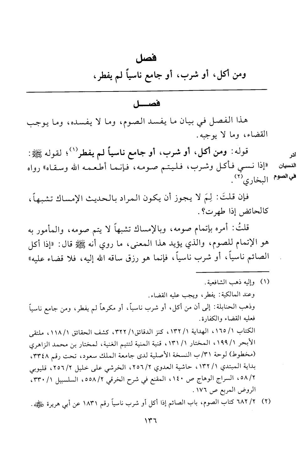 (¬٢) ٢/ ٦٨٢ كتاب الصوم، باب الصائم إذا أكل أو شرب ناسيًا رقم ١٨٣١ عن أبي هريرة -رضي الله عنه-.