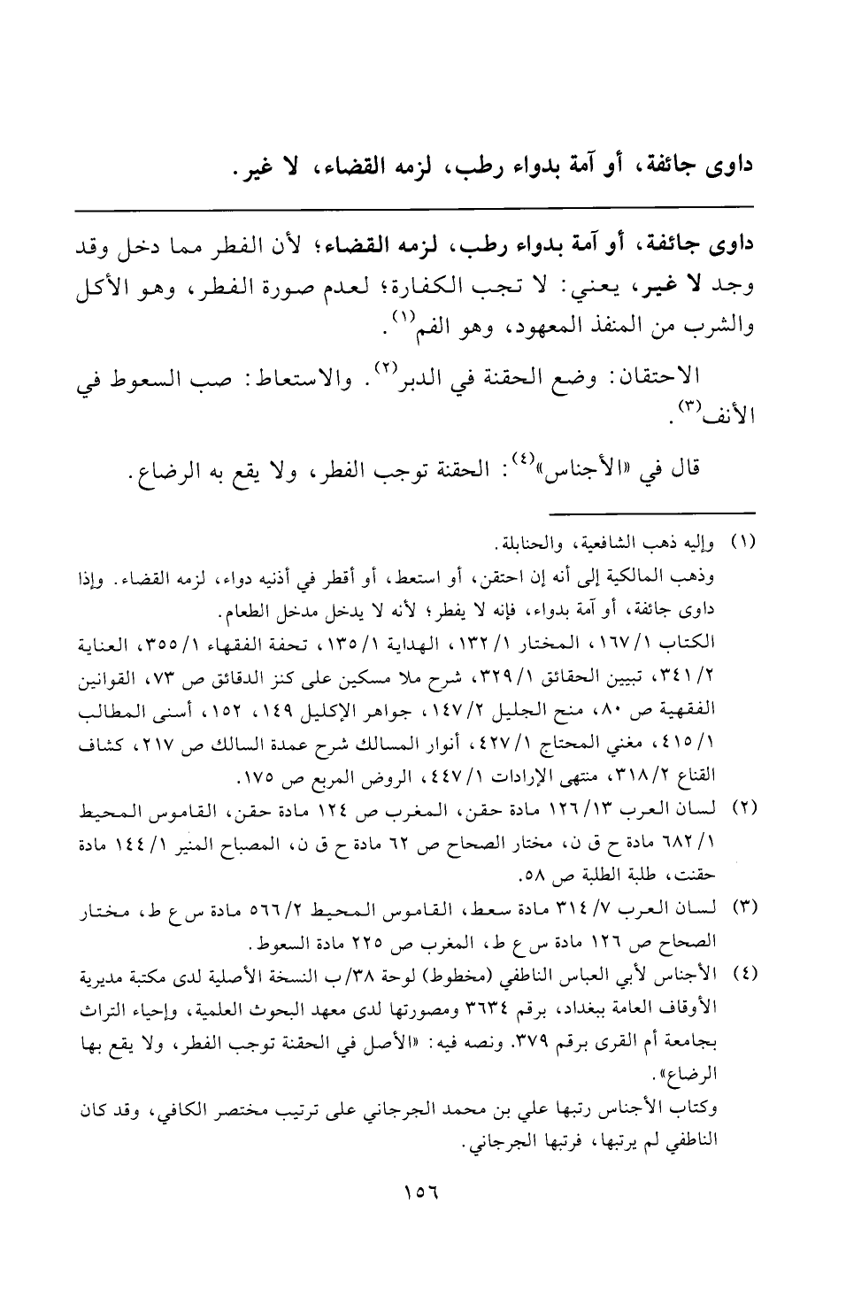 (¬٤) الأجناس لأبي العباس الناطفي (مخطوط) لوحة ٣٨/ ب النسخة الأصلية لدى مكتبة مديرية الأوقاف العامة ببغداد، برقم ٣٦٣٤ ومصورتها لدى معهد البحوث العلمية، وإحياء التراث بجامعة أم القرى برقم ٣٧٩. ونصه فيه: "الأصل في الحقنة توجب الفطر، ولا يقع بها الرضاع".