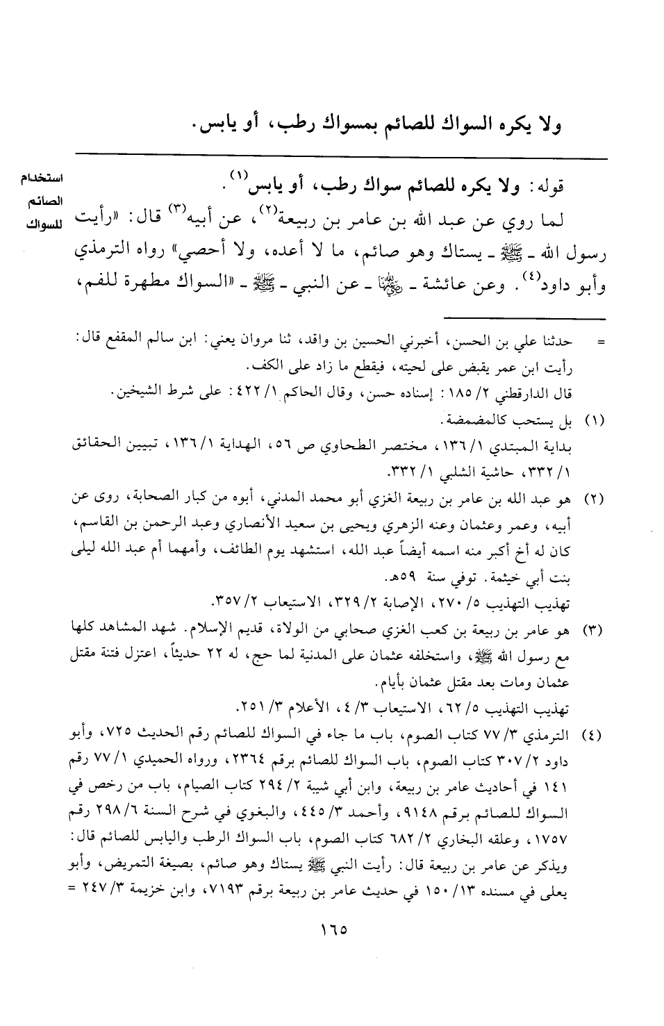 (¬٤) الترمذي ٣/ ٧٧ كتاب الصوم، باب ما جاء في السواك للصائم رقم الحديث ٧٢٥، وأبو داود ٢/ ٣٠٧ كتاب الصوم، باب السواك للصائم برقم ٢٣٦٤، ورواه الحميدي ١/ ٧٧ رقم ١٤١ في أحاديث عامر بن ربيعة، وابن أبي شيبة ٢/ ٢٩٤ كتاب الصيام، باب من رخص في السواك للصائم برقم ٩١٤٨، وأحمد ٣/ ٤٤٥، والبغوي في شرح السنة ٦/ ٢٩٨ رقم ١٧٥٧، وعلقه البخاري ٢/ ٦٨٢ كتاب الصوم، باب السواك الرطب واليابس للصائم قال: ويذكر عن عامر بن ربيعة قال: رأيت النبي -صلى الله عليه وسلم- يستاك وهو صائم، بصيغة التمريض، وأبو يعلى في مسنده ١٣/ ١٥٠ في حديث عامر بن ربيعة برقم ٧١٩٣، وابن خزيمة ٣/ ٢٤٧ =
