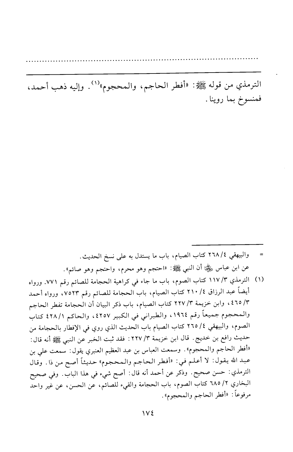 الترمذي من قوله -صلى الله عليه وسلم-: "أفطر الحاجم، والمحجوم" (¬١). وإليه ذهب أحمد، فمنسوخ بما روينا.