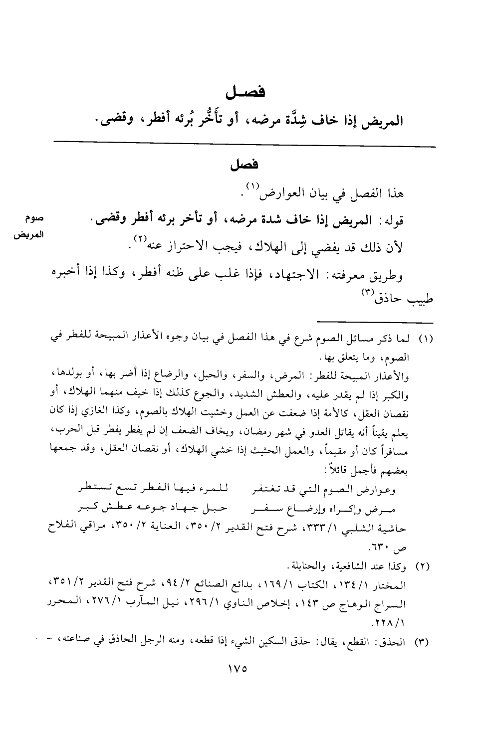 (¬١) لما ذكر مسائل الصوم شرع في هذا الفصل في بيان وجوه الأعذار المبيحة للفطر في الصوم، وما يتعلق بها.