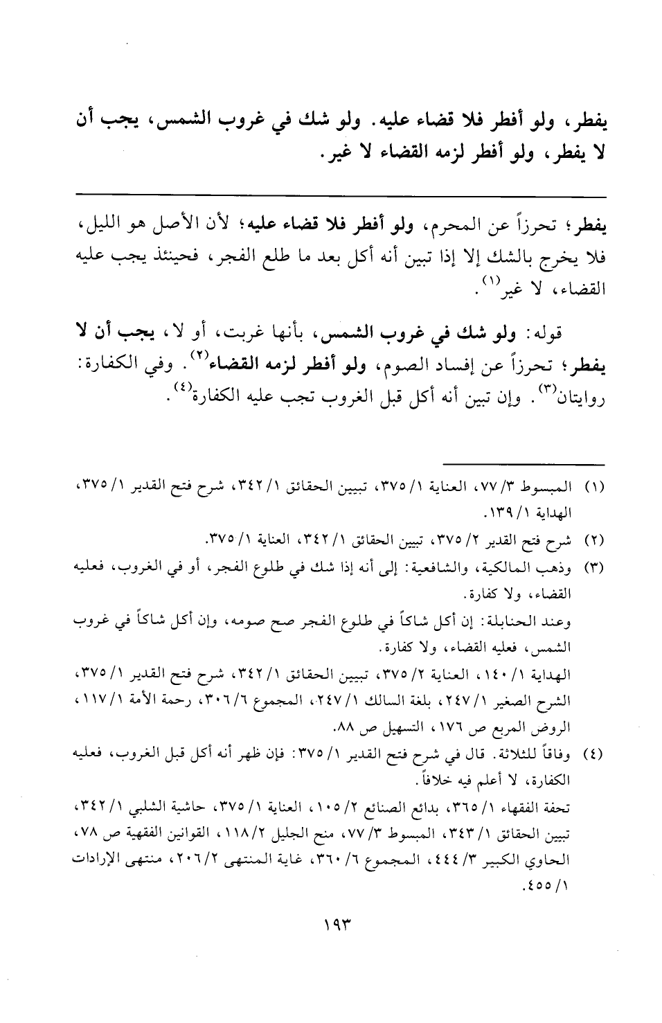 (¬٤) وفاقًا للثلاثة. قال في شرح فتح القدير ١/ ٣٧٥: فإن ظهر أنه أكل قبل الغروب، فعليه الكفارة، لا أعلم فيه خلافًا.