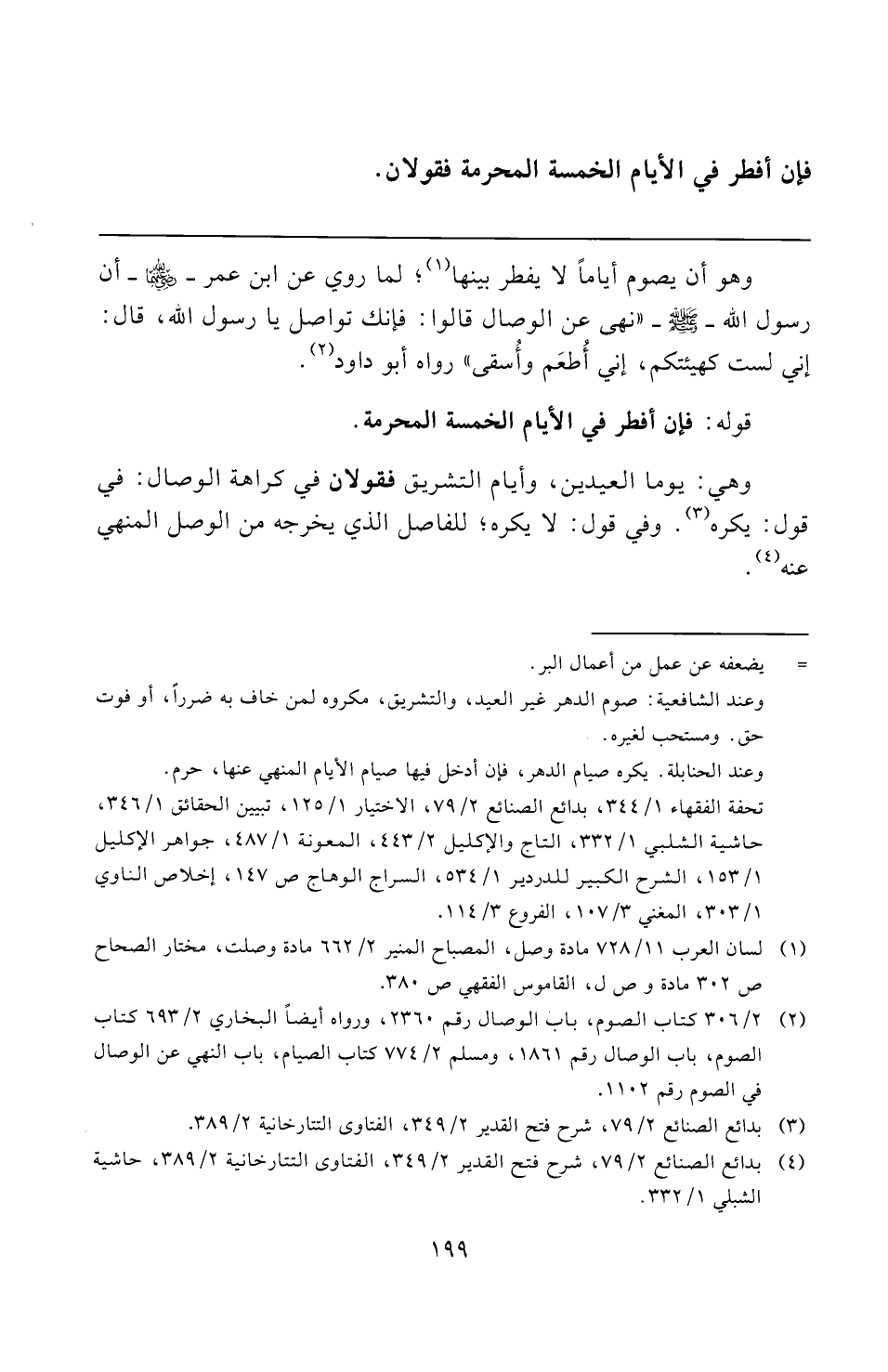 وهي: يوما العيدين، وأيام التشريق فقولان في كراهة الوصال: في قول: يكره (¬٣). وفي قول: لا يكره؛ للفاصل الذي يخرجه من الوصل المنهي عنه (¬٤).