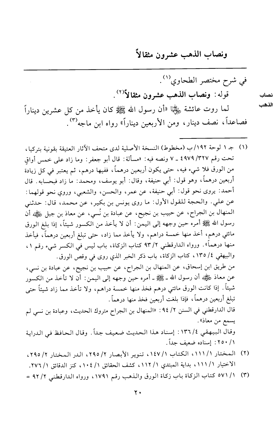 (¬١) جـ ١ لوحة ١٩٢/ ب (مخطوط) النسخة الأصلية لدى متحف الآثار العتيقة بقونية بتركيا، تحت رقم ٣٢٧/ ٤٩٧٩ - ٧ ونصه فيه: "مسألة: قال أبو جعفر: وما زاد على خمس أواقٍ من الورق فلا شيء فيه، حتى يكون أربعين درهمًا، ففيها درهم، ثم يعتبر في كل زيادة أربعين درهمًا، وهو قول: أبي حنيفة، وقال: أبو يوسف، ومحمد: ما زاد فبحسابه. قال أحمد: يروى نحو قول: أبي حنيفة، عن عمر، والحسن، والشعبي، وروي نحو قولهما: عن علي. والحجة للقول الأول: ما روى يونس بن بكير، عن محمد، قال: حدثني المنهال بن الجراح، عن حبيب بن نجيح، عن عبادة بن نُسي، عن معاذ بن جبل -رضي الله عنه- أن رسول الله -صلى الله عليه وسلم- أمره حين وجهه إلى اليمن: أن لا يأخذ من الكسور شيئًا، إذا بلغ الورق مائتي درهم، أخذ منها خمسة دراهم، ولا يأخذ مما زاد، حتى تبلغ أربعين درهمًا، فيأخذ منها درهمًا". ورواه الدارقطني ٢/ ٩٣ كتاب الزكاة، باب ليس في الكسر شيء رقم ١، والبيهقي ٤/ ١٣٥، كتاب الزكاة، باب ذكر الخبر الذي روى في وقص الورق.