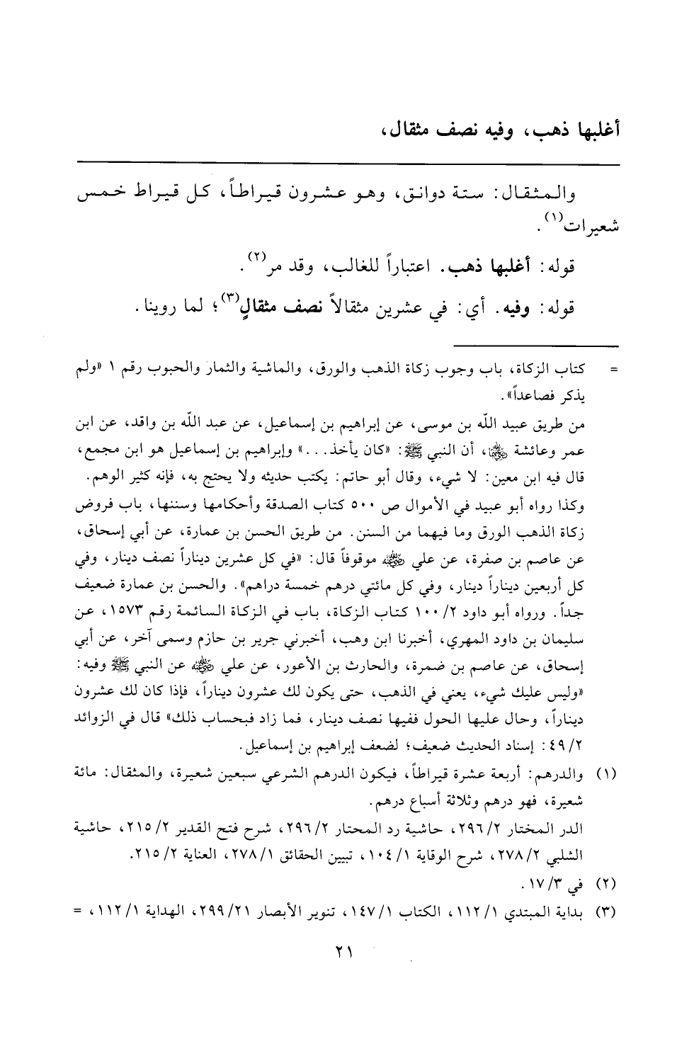 (¬١) والدرهم: أربعة عشرة قيراطًا، فيكون الدرهم الشرعي سبعين شعيرة، والمثقال: مائة شعيرة، فهو درهم وثلاثة أسباع درهم.