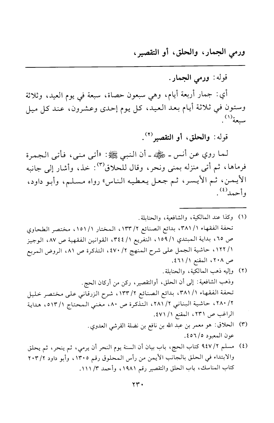 (¬٤) مسلم ٢/ ٩٤٧ كتاب الحج، باب بيان أن السنة يوم النحر أن يرمي، ثم ينحر، ثم يحلق والابتداء في الحلق بالجانب الأيمن من رأس المحلوق رقم ١٣٠٥، وأبو داود ٢/ ٢٠٣ كتاب المناسك، باب الحلق والتقصير رقم ١٩٨١، وأحمد ٣/ ١١١.