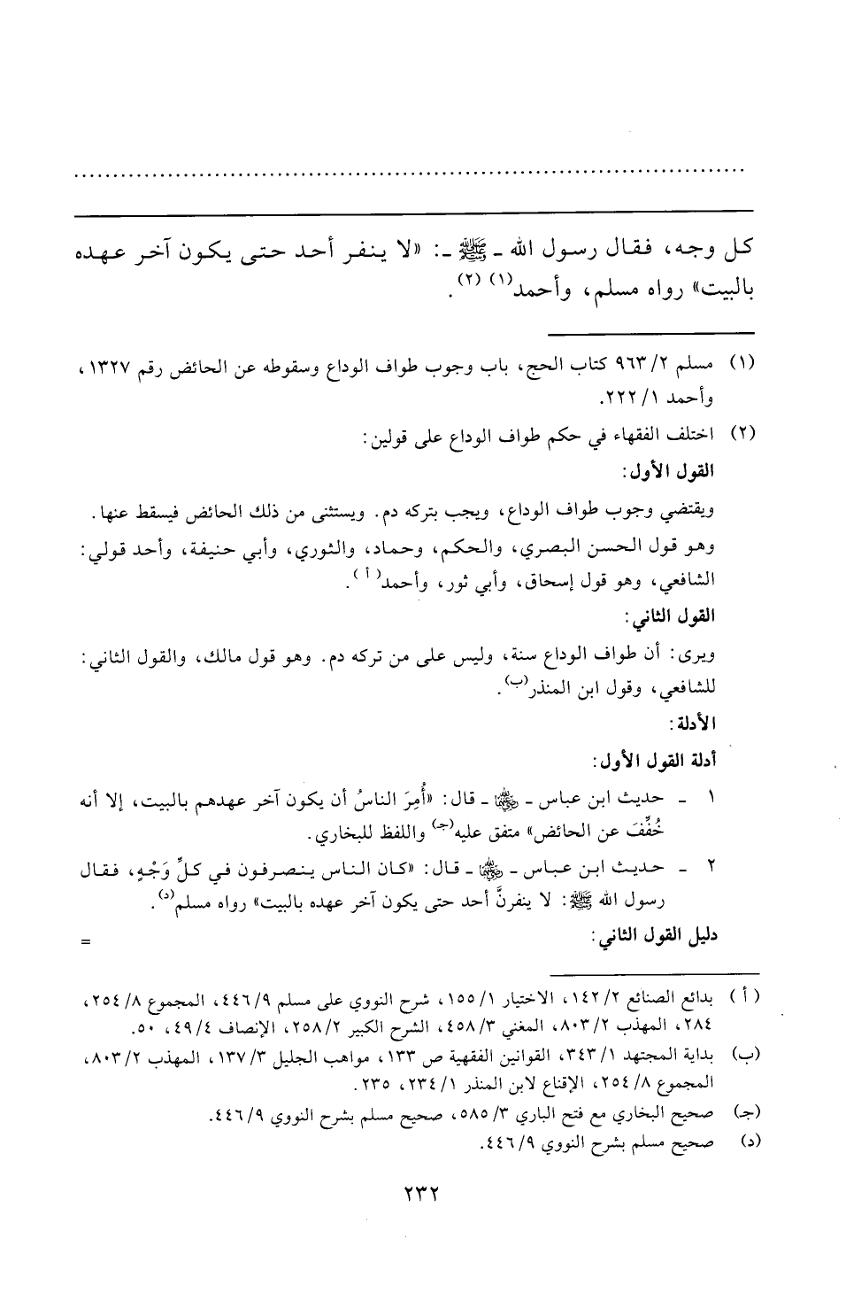 (¬١) مسلم ٢/ ٩٦٣ كتاب الحج، باب وجوب طواف الوداع وسقوطه عن الحائض رقم ١٣٢٧، وأحمد ١/ ٢٢٢.
