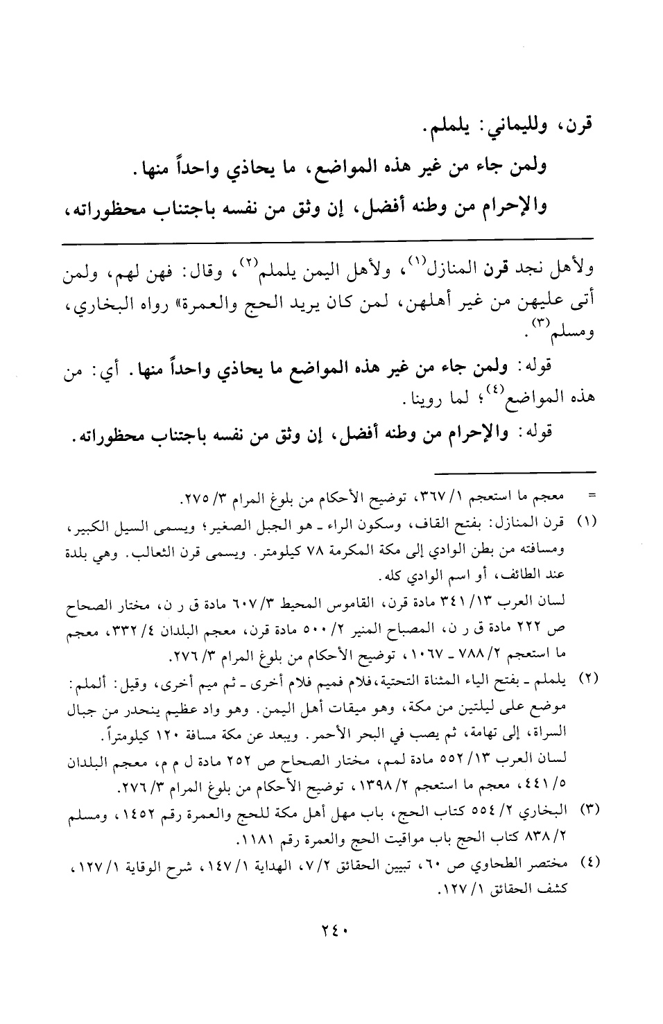 لسان العرب ١٣/ ٣٤١ مادة قرن، القاموس المحيط ٣/ ٦٠٧ مادة ق ر ن، مختار الصحاح ص ٢٢٢ مادة ق ر ن، المصباح المنير ٢/ ٥٠٠ مادة قرن، معجم البلدان ٤/ ٣٣٢، معجم ما استعجم ٢/ ٧٨٨ - ١٠٦٧، توضيح الأحكام من بلوغ المرام ٣/ ٢٧٦.