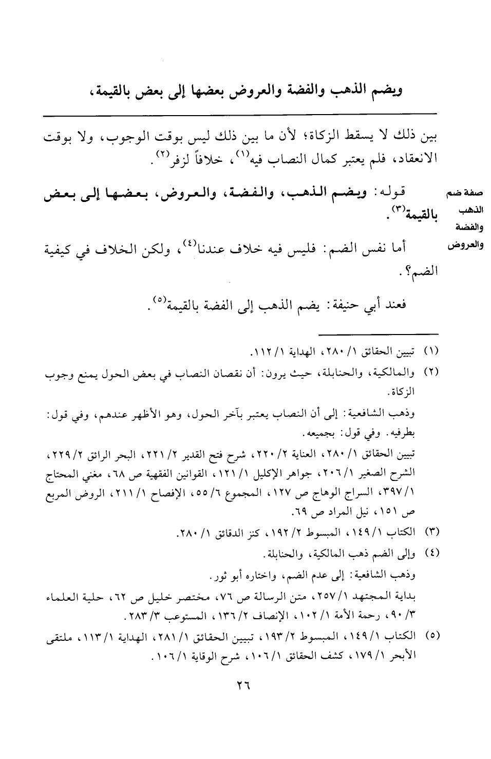 ويضم الذهب والفضة والعروض بعضها إلى بعض بالقيمة،