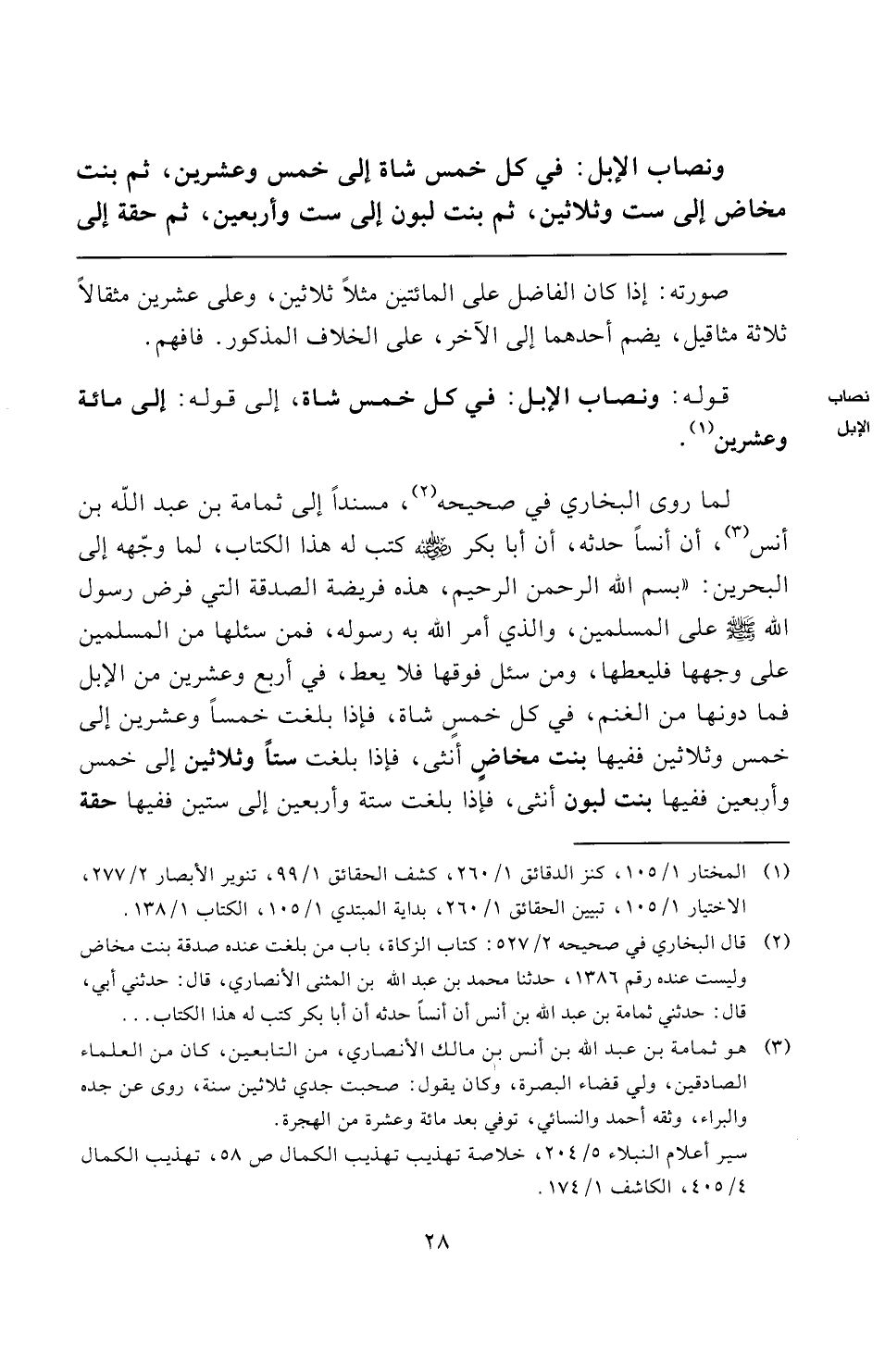 لما روى البخاري في صحيحه (¬٢)، مسندًا إلى ثمامة بن عبد الله بن أنس (¬٣)، أن أنسًا حدثه، أن أبا بكر -رضي الله عنه- كتب له هذا الكتاب، لما وجّهه إلى البحرين: "بسم الله الرحمن الرحيم، هذه فريضة الصدقة التي فرض رسول الله -صلى الله عليه وسلم- على المسلمين، والذي أمر الله به رسوله، فمن سئلها من المسلمين على وجهها فليعطها، ومن سئل فوقها فلا يعط، في أربع وعشرين من الإبل فما دونها من الغنم، في كل خمسٍ شاة، فإذا بلغت خمسًا وعشرين إلى خمس وثلاثين ففيها بنت مخاضٍ أنثى، فإذا بلغت ستًا وثلاثين إلى خمس وأربعين ففيها بنت لبون أنثى، فإذا بلغت ستة وأربعين إلى ستين ففيها حقة