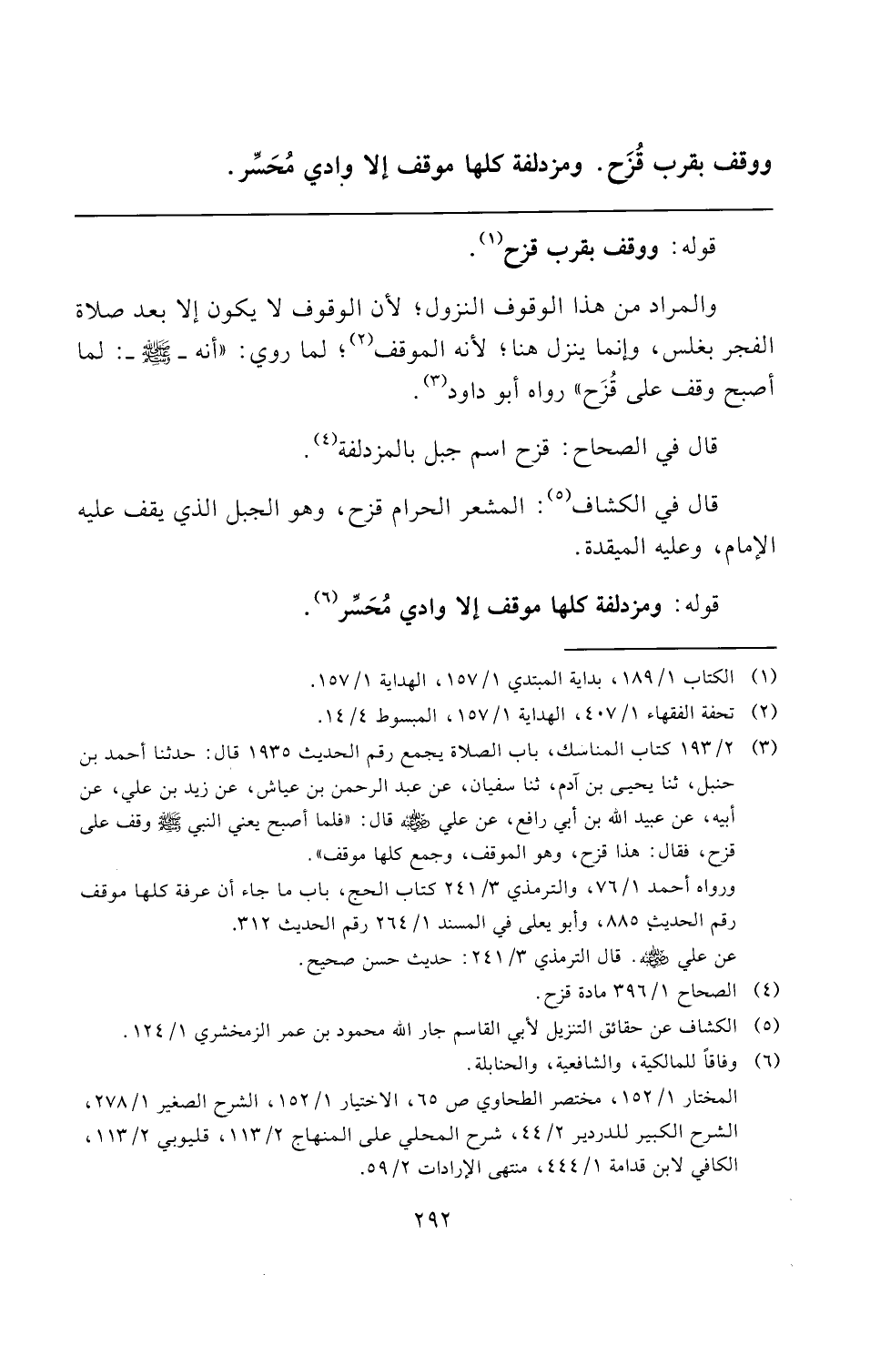 (¬٣) ٢/ ١٩٣ كتاب المناسك، باب الصلاة يجمع رقم الحديث ١٩٣٥ قال: حدثنا أحمد بن حنبل، ثنا يحيى بن آدم، ثنا سفيان، عن عبد الرحمن بن عياش، عن زيد بن علي، عن أبيه، عن عبيد الله بن أبي رافع، عن علي -رضي الله عنه- قال: "فلما أصبح يعني النبي -صلى الله عليه وسلم- وقف على قزح، فقال: هذا قزح، وهو الموقف، وجمع كلها موقف".