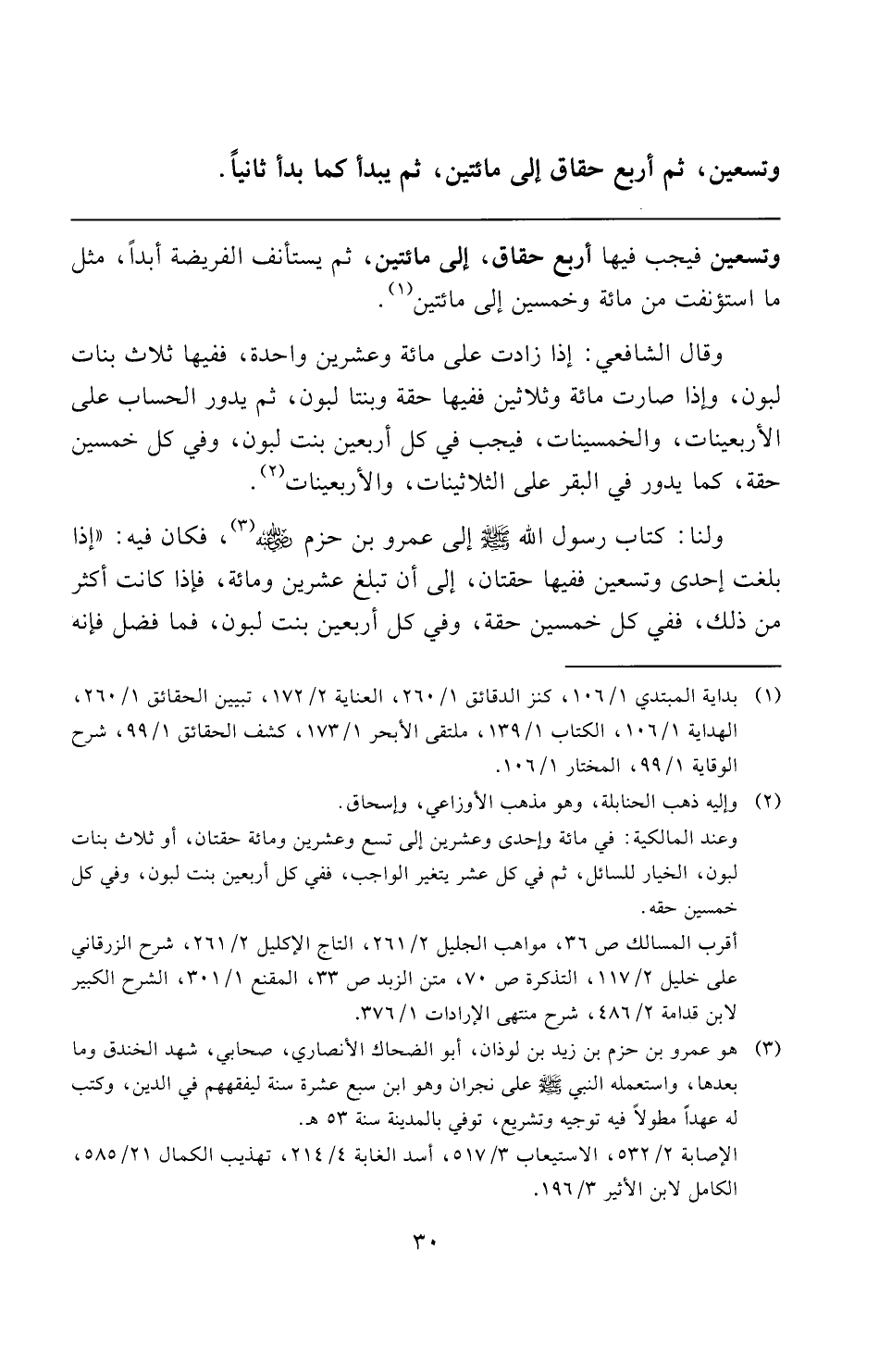 ولنا: كتاب رسول الله -صلى الله عليه وسلم- إلى عمرو بن حزم -رضي الله عنه- (¬٣)، فكان فيه: "إذا بلغت إحدى وتسعين ففيها حقتان، إلى أن تبلغ عشرين ومائة، فإذا كانت أكثر من ذلك، ففي كل خمسين حقة، وفي كل أربعين بنت لبون، فما فضل فإنه