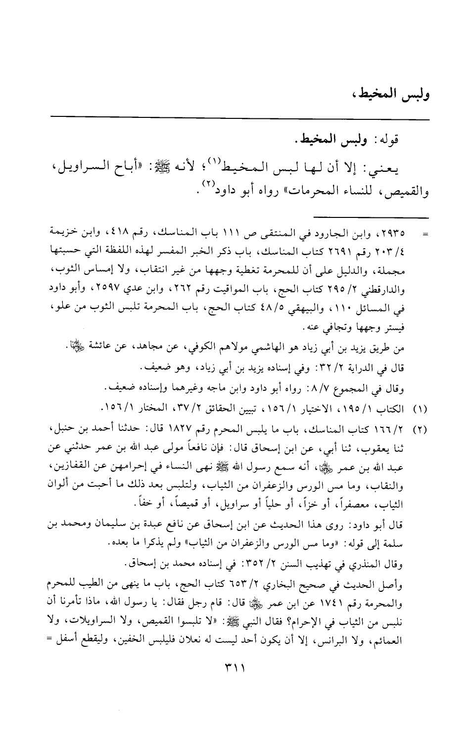 (¬٢) ٢/ ١٦٦ كتاب المناسك، باب ما يلبس المحرم رقم ١٨٢٧ قال: حدثنا أحمد بن حنبل، ثنا يعقوب، ثنا أبي، عن ابن إسحاق قال: فإن نافعًا مولى عبد الله بن عمر حدثني عن عبد الله بن عمر -رضي الله عنهما-، أنه سمع رسول الله -صلى الله عليه وسلم- نهى النساء في إحرامهن عن القفازين، والنقاب، وما مس الورس والزعفران من الثياب، ولتلبس بعد ذلك ما أحبت من ألوان الثياب، معصفرًا، أو خزًا، أو حليًا أو سراويل، أو قميصًا، أو خفًا.