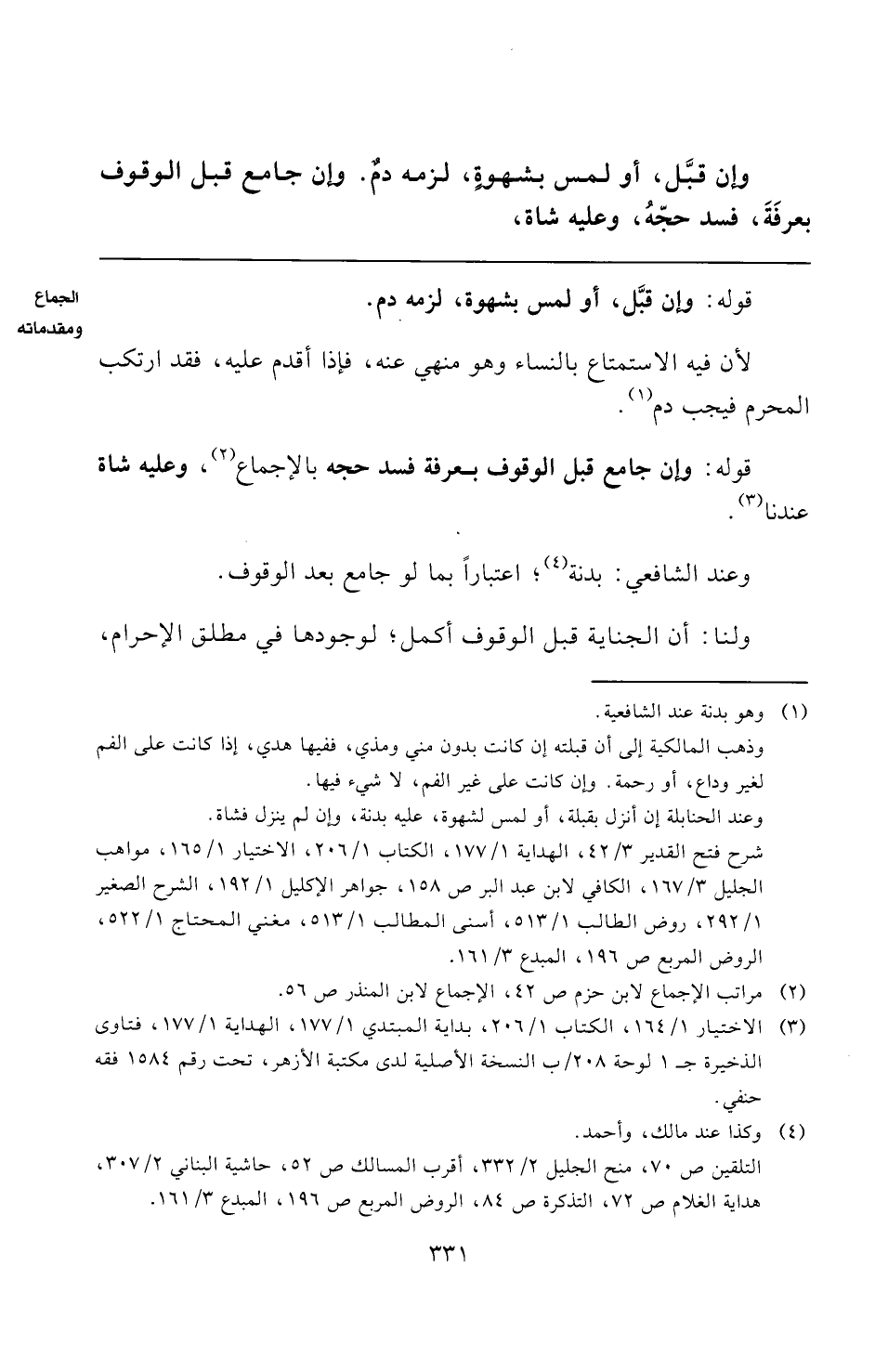 وإن قبَّل، أو لمس بشهوةٍ، لزمه دمٌ. وإن جامع قبل الوقوف بعرفَةَ، فسد حجّهُ، وعليه شاة،