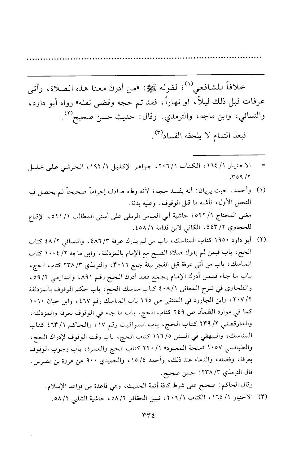 خلافًا للشافعي (¬١)؛ لقوله -صلى الله عليه وسلم-: "من أدرك معنا هذه الصلاة، وأتى عرفات قبل ذلك ليلًا، أو نهارًا، فقد تم حجه وقضى تفثه" رواه أبو داود، والنسائي، وابن ماجه، والترمذي. وقال: حديث حسن صحيح (¬٢).
