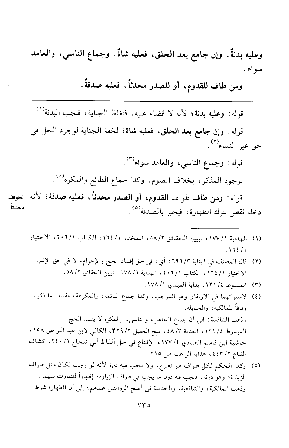 قوله: ومن طاف طواف القدوم، أو الصدر محدثًا، فعليه صدقة؛ لأنه دخله نقص بترك الطهارة، فيجبر بالصدقة (¬٥).