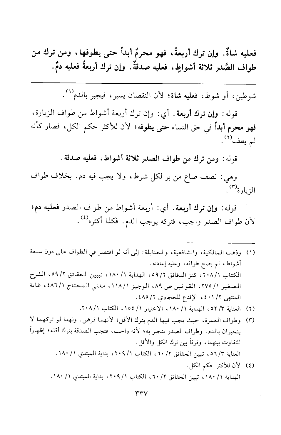 (¬٣) وطواف العمرة، حيث يجب فيها الدم بترك الأقل؛ لأنهما فرض. ولهذا لو تركهما لا ينجبران بالدم. وطواف الصدر ينجبر به؛ لأنه واجب، فتجب الصدقة بترك أقله؛ إظهارًا للتفاوت بينهما، وفرقًا بين ترك الكل والأقل.