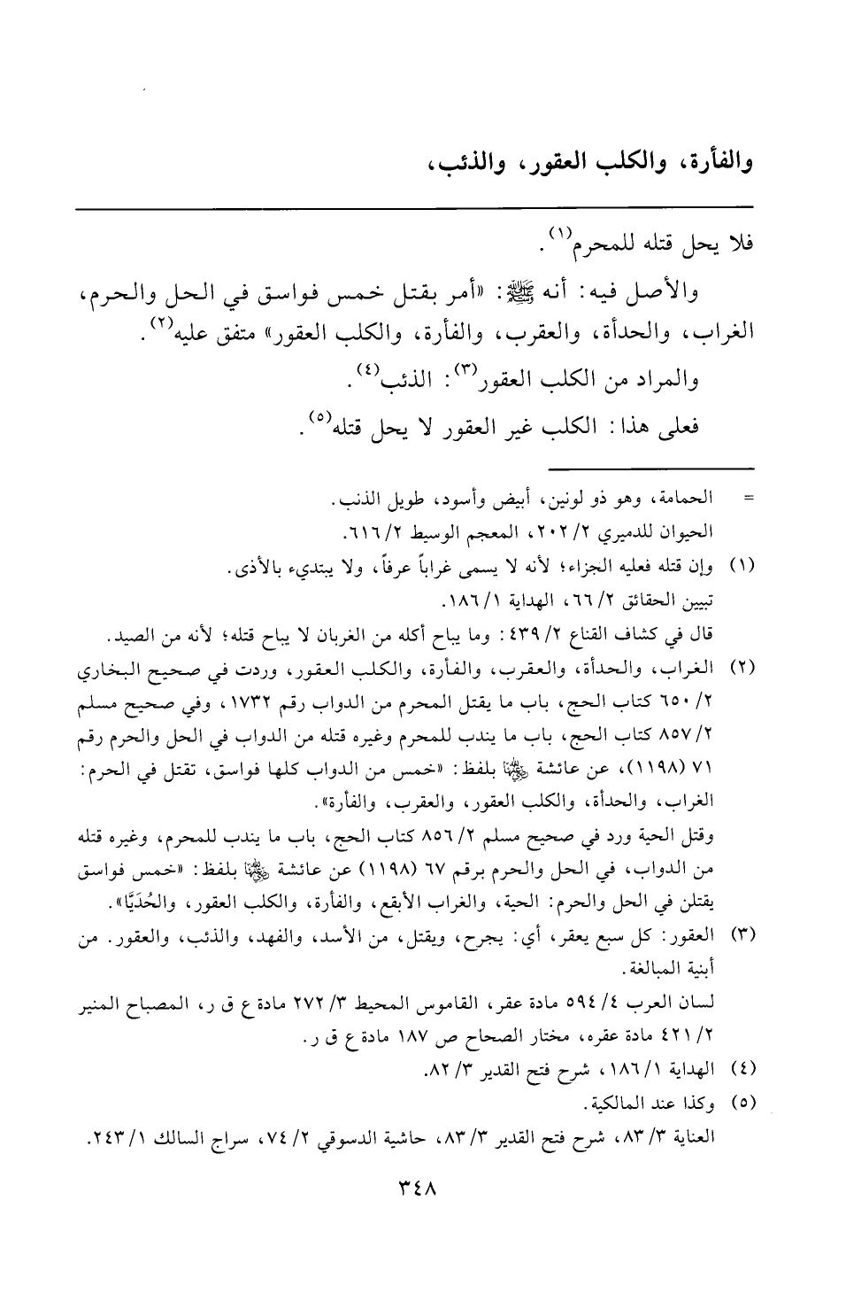(¬٢) الغراب، والحدأة، والعقرب، والفأرة، والكلب العقور، وردت في صحيح البخاري ٢/ ٦٥٠ كتاب الحج، باب ما يقتل المحرم من الدواب رقم ١٧٣٢، وفي صحيح مسلم ٢/ ٨٥٧ كتاب الحج، باب ما يندب للمحرم وغيره قتله من الدواب في الحل والحرم رقم ٧١ (١١٩٨)، عن عائشة -رضي الله عنها- بلفظ: "خمس من الدواب كلها فواسق، تقتل في الحرم: الغراب، والحدأة، والكلب العقور، والعقرب، والفأرة".