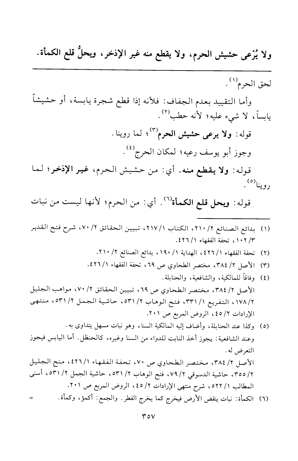 ولا يُرْعى حشيش الحرم، ولا يقطع منه غير الإذخر، ويحلُّ قلع الكمأة.