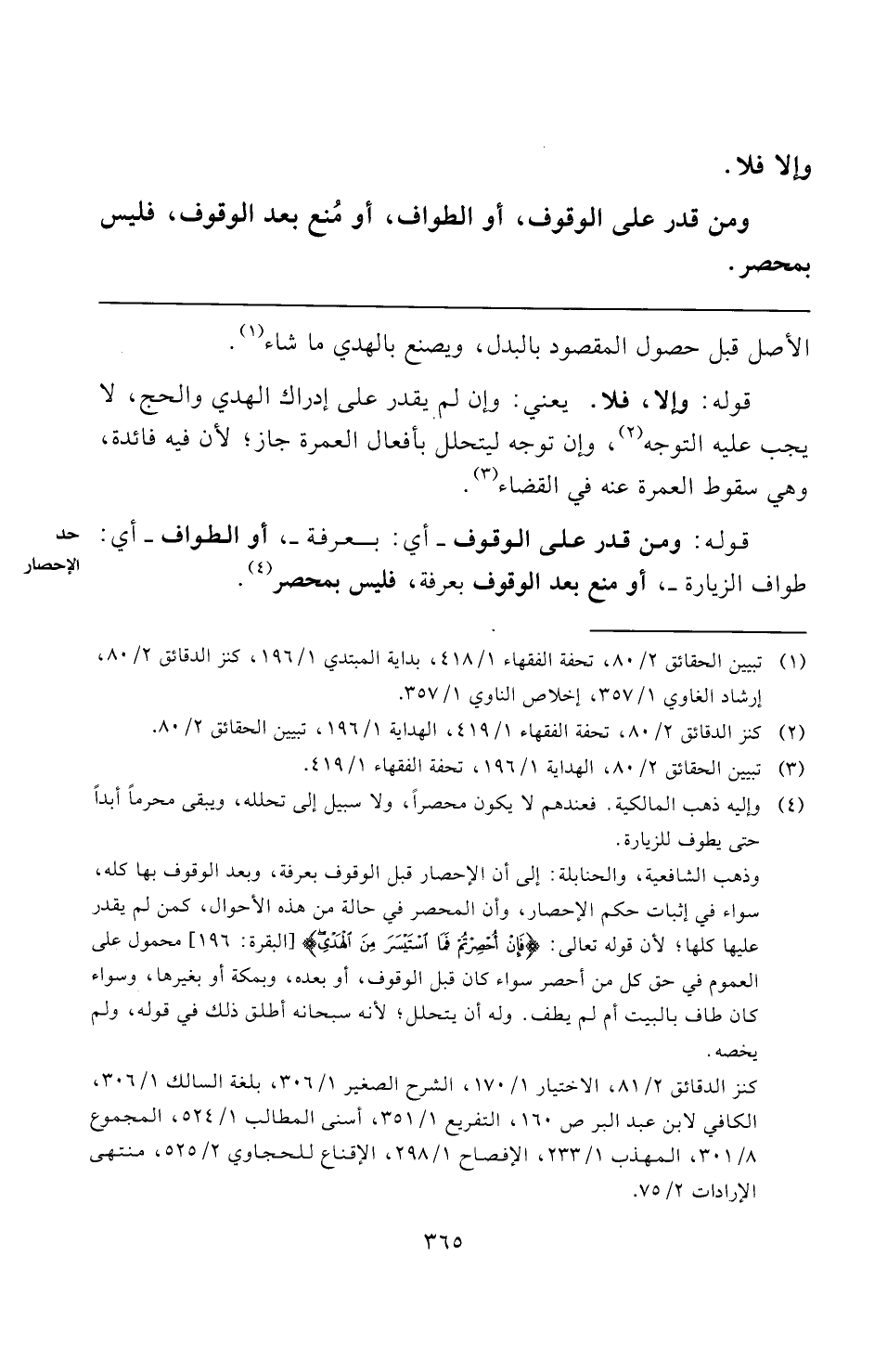(¬٤) وإليه ذهب المالكية. فعندهم لا يكون محصرًا، ولا سبيل إلى تحلله، ويبقى محرمًا أبدًا حتى يطوف للزيارة.