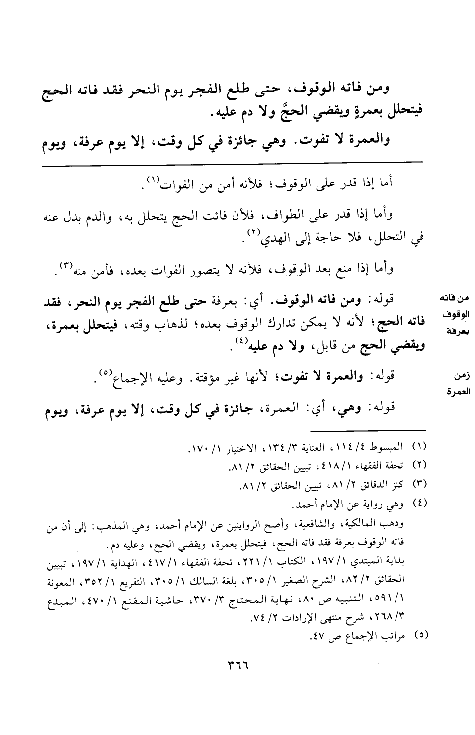 قوله: ومن فاته الوقوف. أي: بعرفة حتى طلع الفجر يوم النحر، فقد فاته الحج؛ لأنه لا يمكن تدارك الوقوف بعده؛ لذهاب وقته، فيتحلل بعمرة، ويقضي الحج من قابل، ولا دم عليه (¬٤).