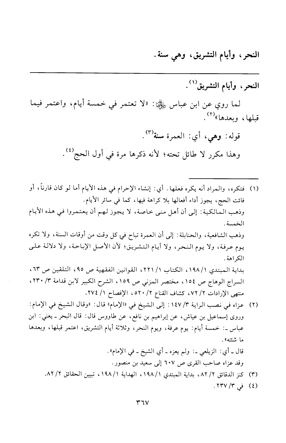 وذهب الشافعية، والحنابلة: إلى أن العمرة تباح في كل وقت من أوقات السنة، ولا تكره يوم عرفة، ولا يوم النحر، ولا أيام التشريق؛ لأن الأصل الإباحة، ولا دلالة على الكراهة.
