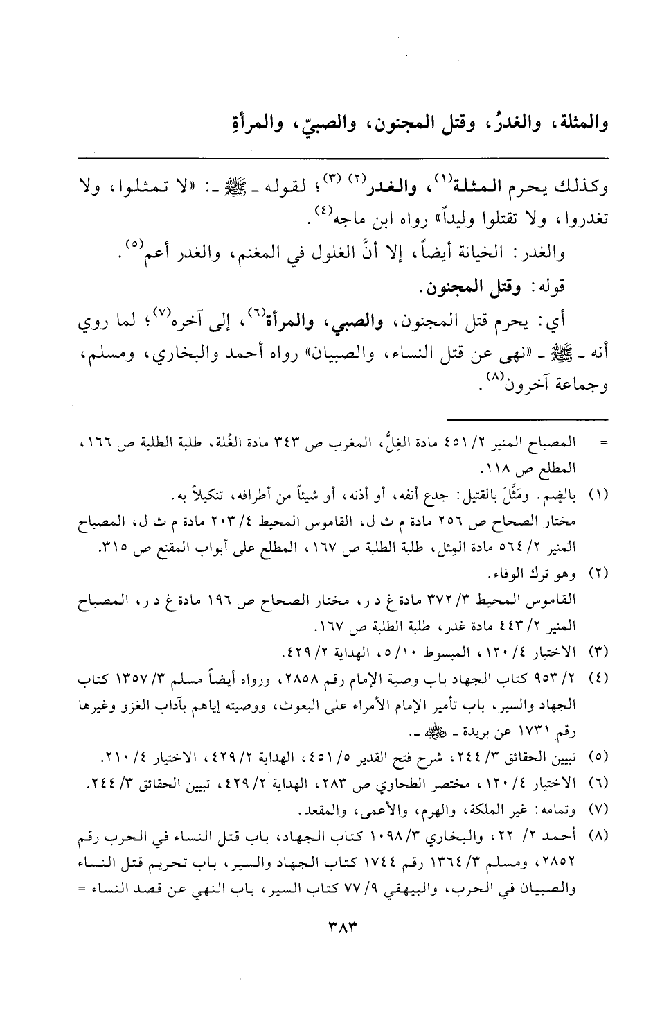 والمثلة، والغدرُ، وقتل المجنون، والصبيّ، والمرأةِ