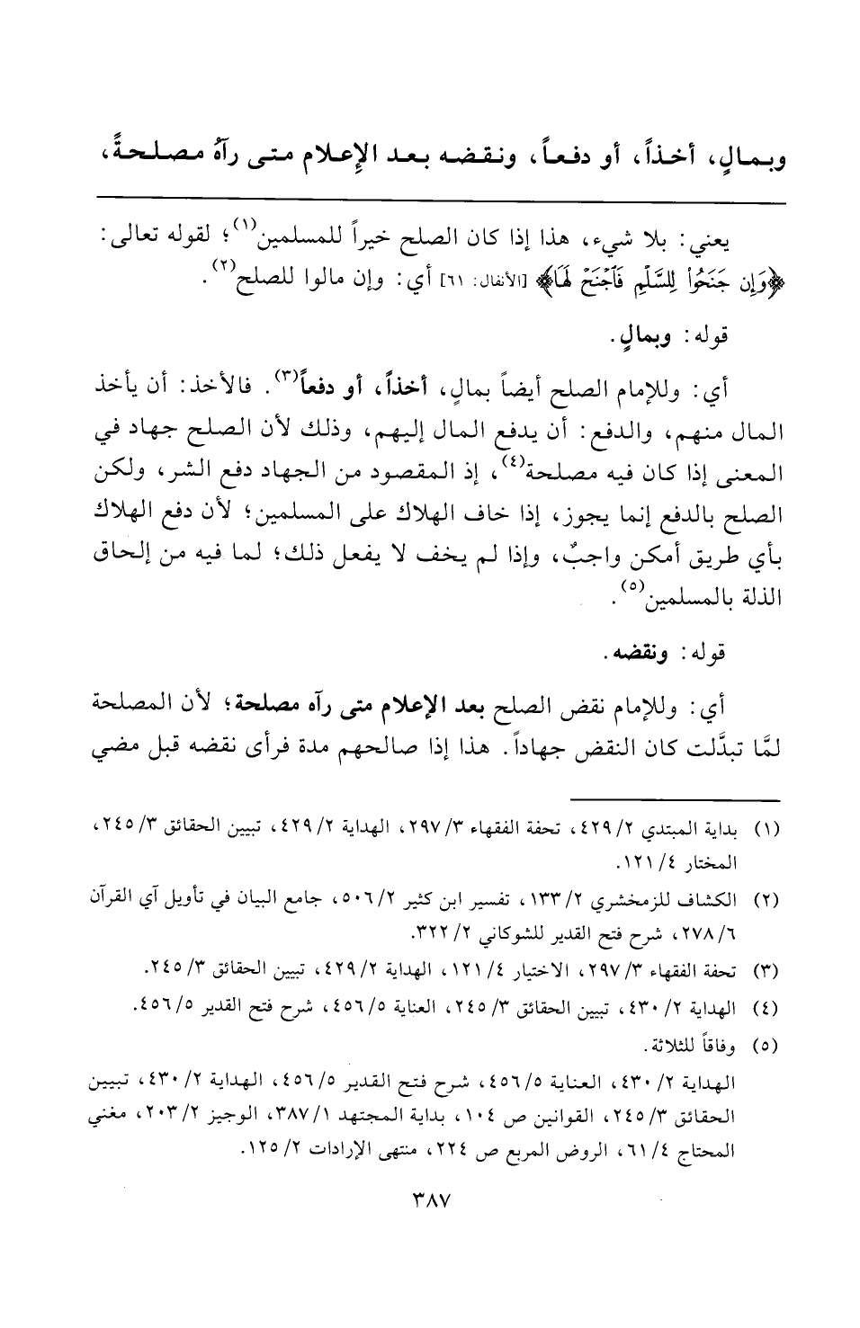 أي: وللإمام الصلح أيضًا بمالٍ، أخذًا، أو دفعًا (¬٣). فالأخذ: أن يأخذ المال منهم، والدفع: أن يدفع المال إليهم، وذلك لأن الصلح جهاد في المعنى إذا كان فيه مصلحة (¬٤)، إذ المقصود من الجهاد دفع الشر، ولكن الصلح بالدفع إنما يجوز، إذا خاف الهلاك على المسلمين؛ لأن دفع الهلاك بأي طريق أمكن واجبٌ، وإذا لم يخف لا يفعل ذلك؛ لما فيه من إلحاق الذلة بالمسلمين (¬٥).