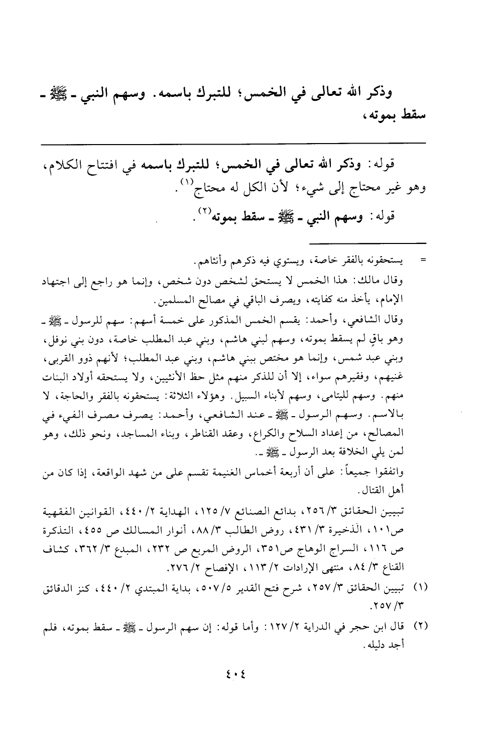(¬٢) قال ابن حجر في الدراية ٢/ ١٢٧: وأما قوله: إن سهم الرسول -صلى الله عليه وسلم- سقط بموته، فلم أجد دليله.